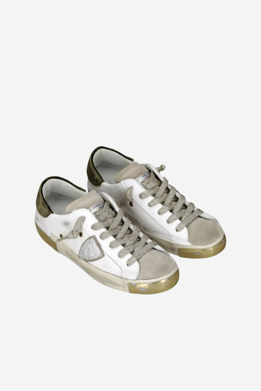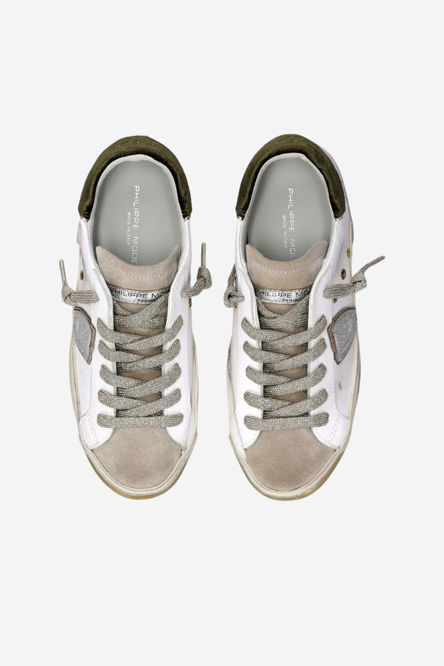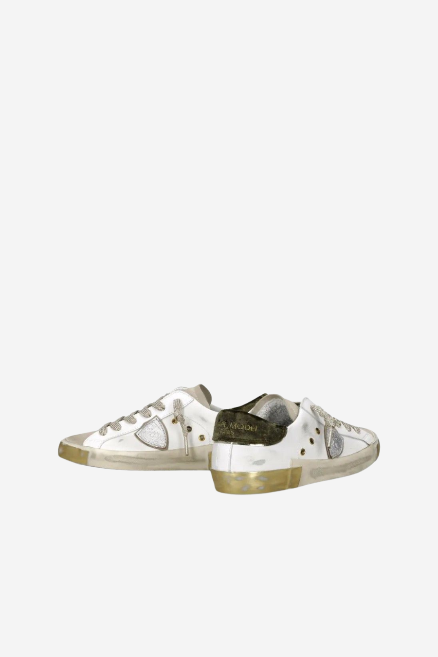 Philippe Model Paris sneakers in white leather with a gray suede tongue with a distressed effect. Silver laminated leather brand crest and beige leather trim. Glitter laces. Khaki velvet heel detail with gold embroidered logo. New patented white and gold vintage-effect box sole. 2.5 cm insole.