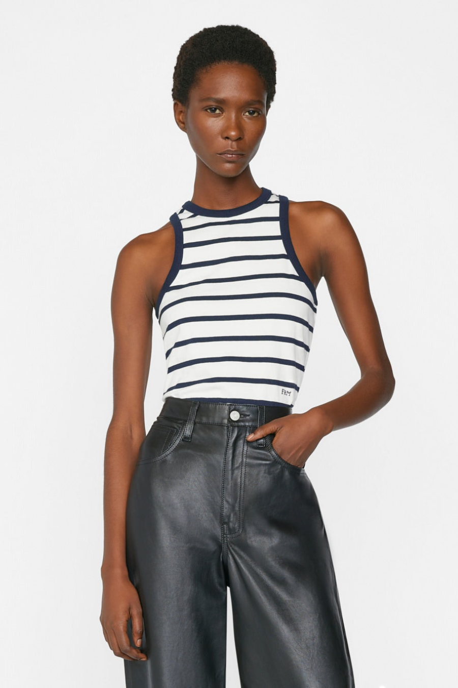 Close-fitting and crafted from ultra-soft organic cotton jersey with just enough stretch, this striped racerback-style tank features curved straps, extra-large armholes, and the FRM insignia embroidered in white. A true closet staple for layering in the winter and wearing solo all summer.