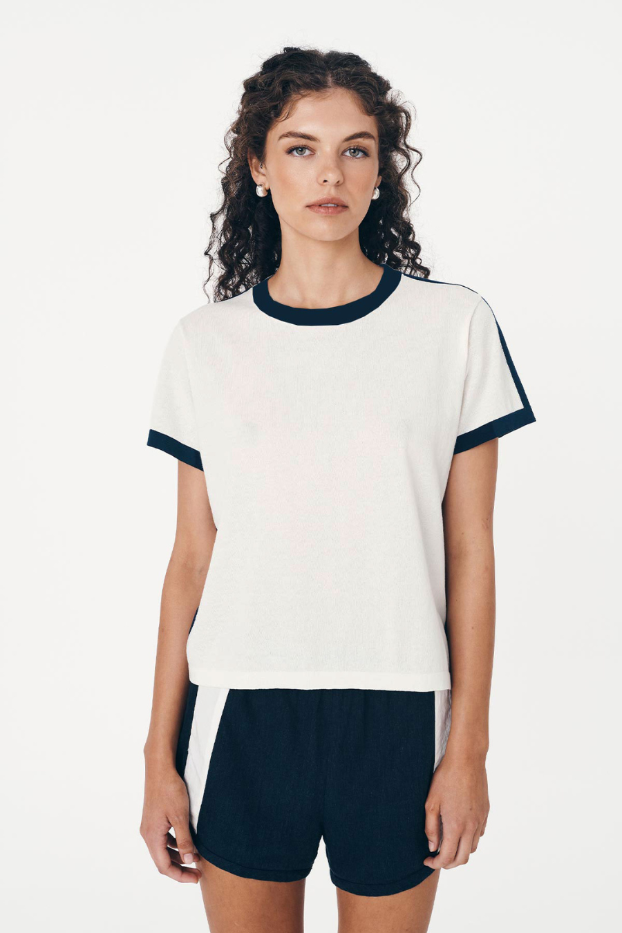 The Rania Tee in Ink is cut relaxed with a mid-length hem and contrast stripe borders.