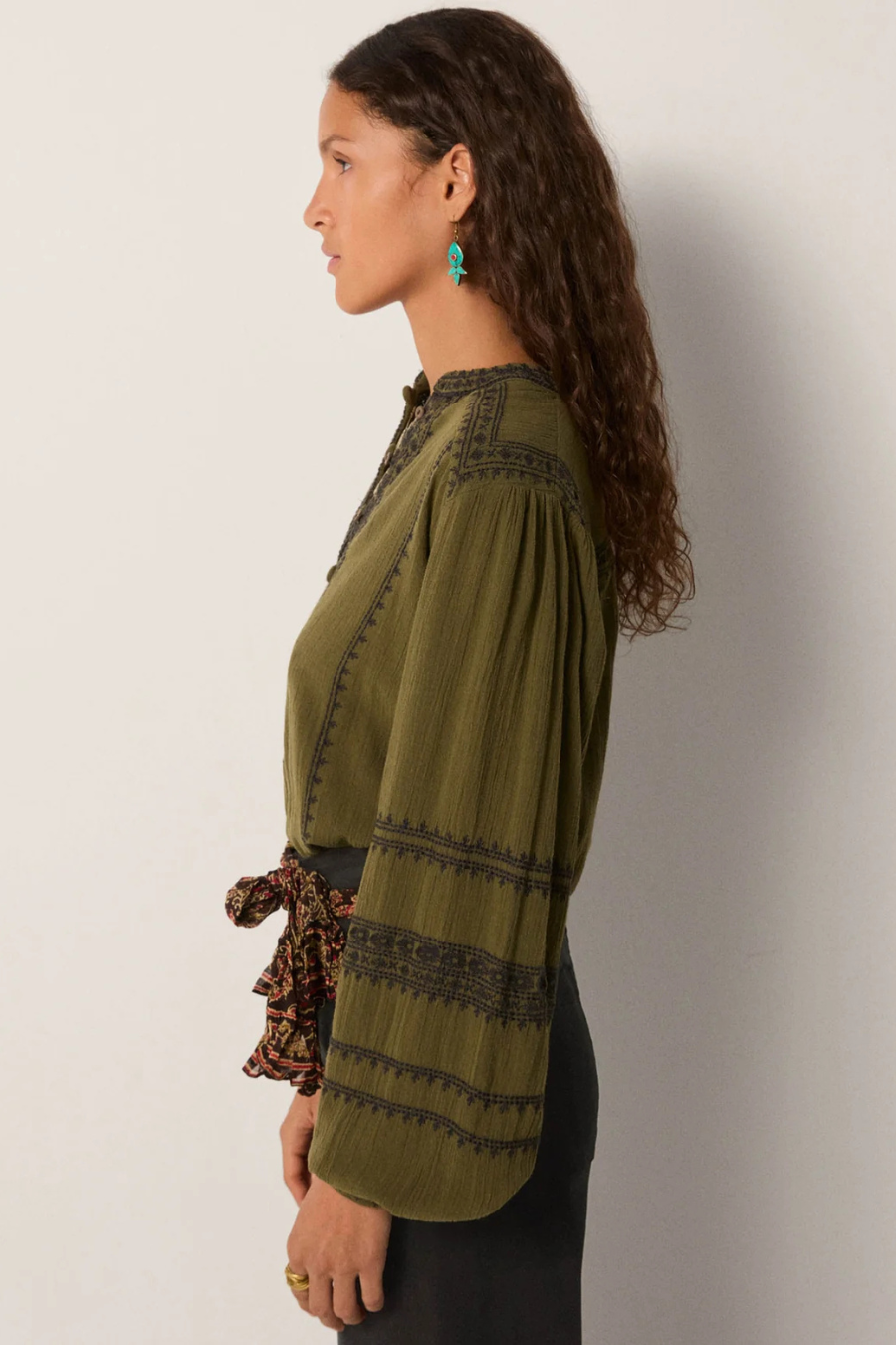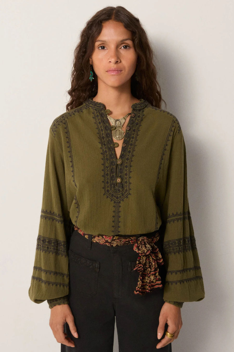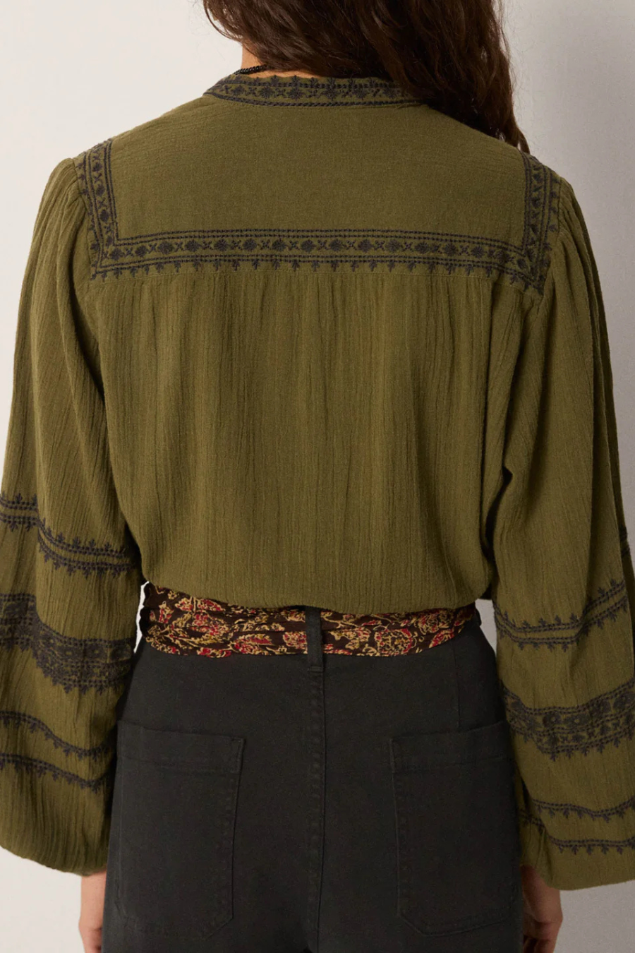 Deep threadwork embroidery runs across chest and sleeves, subtle but strong, creating relief across the quiet surface. The detailing lends body to the otherwise softened crepe.