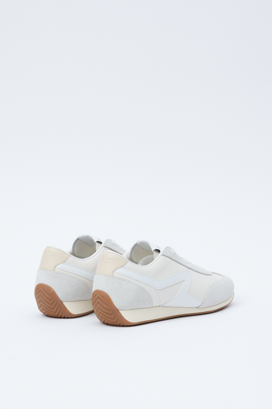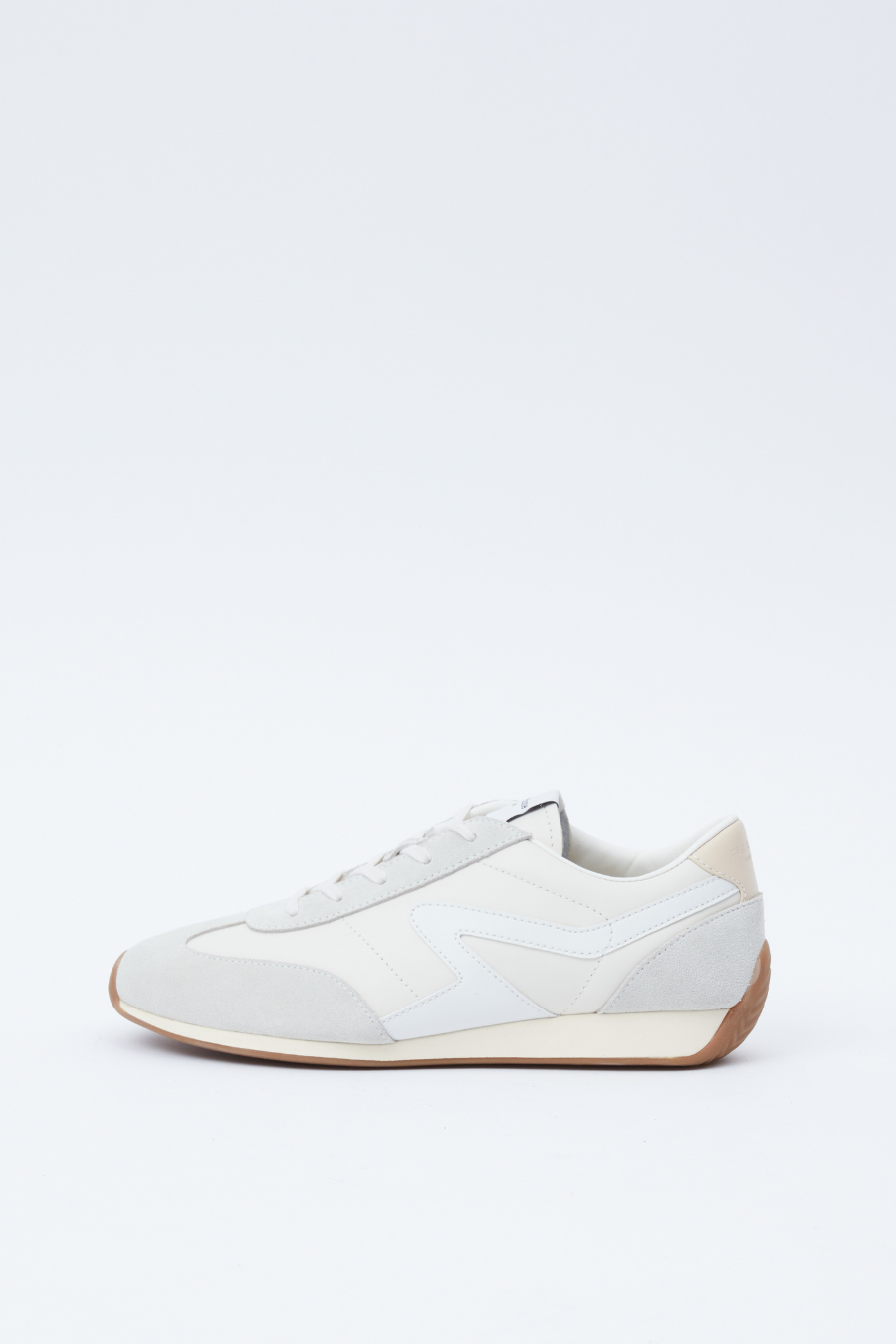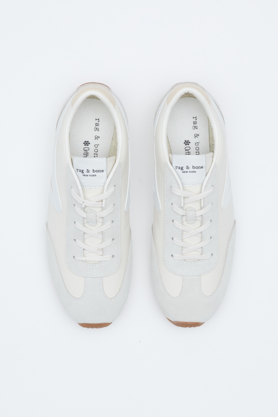 The Retro Runner. A slimmer take on an old-school trainer. This retro-inspired almond toe sneaker is made from a varsity-inspired satin nylon and soft Nappa suede. Crafted with dual-density antimicrobial foam insoles: OrthoLite Lazy-Hybrid for custom-fit comfort, and OrthoLite Recycled for stability and support.