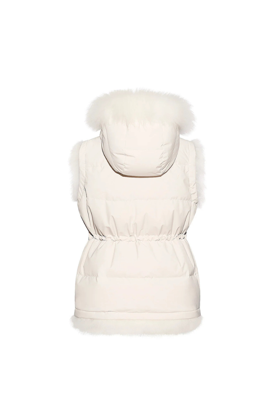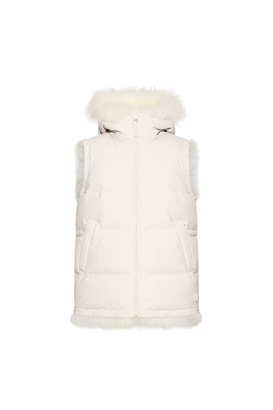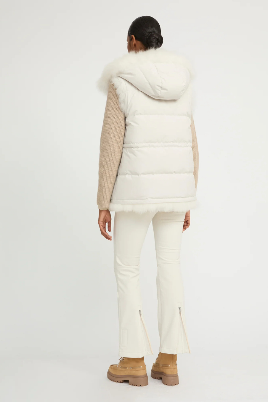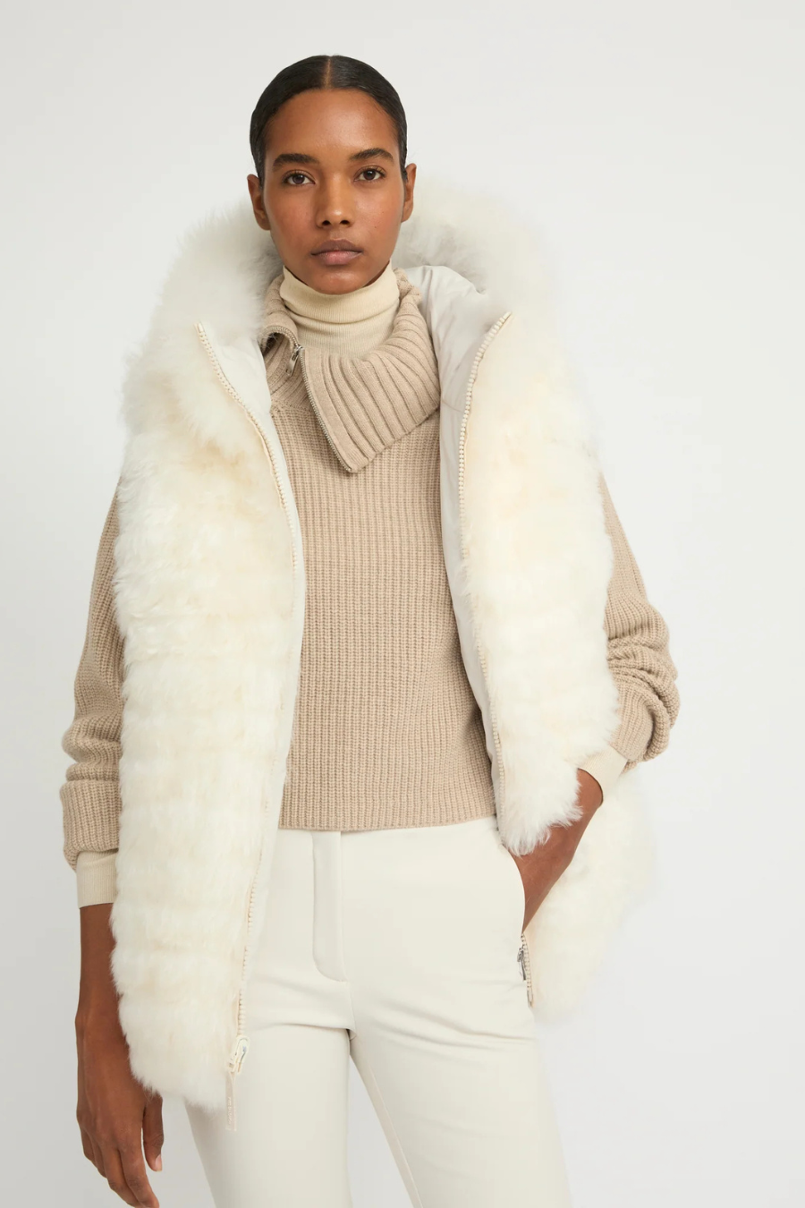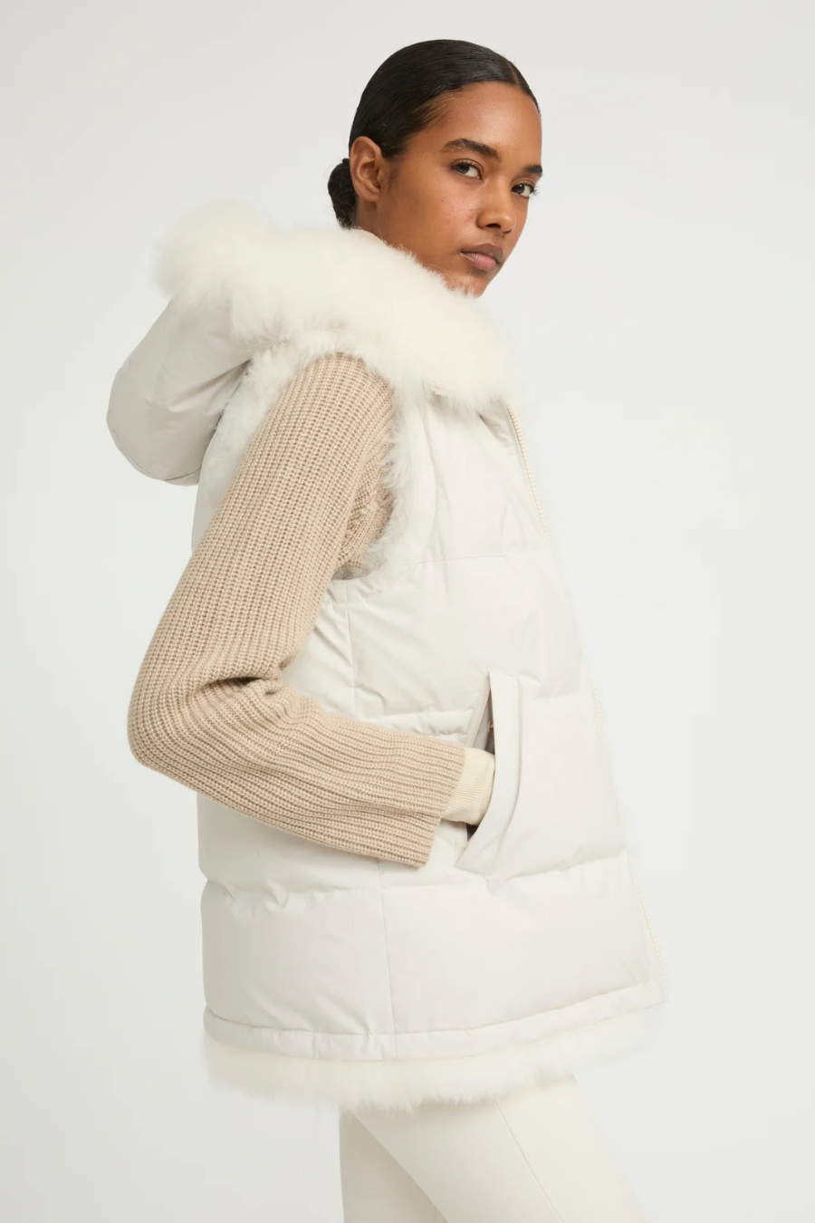 A combination of style and technical edge for this gilet that is both elegant and functional. Its technical fabric and high quality down lining have been tested to a temperature of -10°C to ensure protection against the cold. The airy texture of long-haired Merino shearling provides a sophisticated visual element as well as softness and warmth for a piece which can be worn alone, or layered over a jacket for added comfort. This reversible piece features a non-removable hood and a drawstring waist to cinch the silhouette.