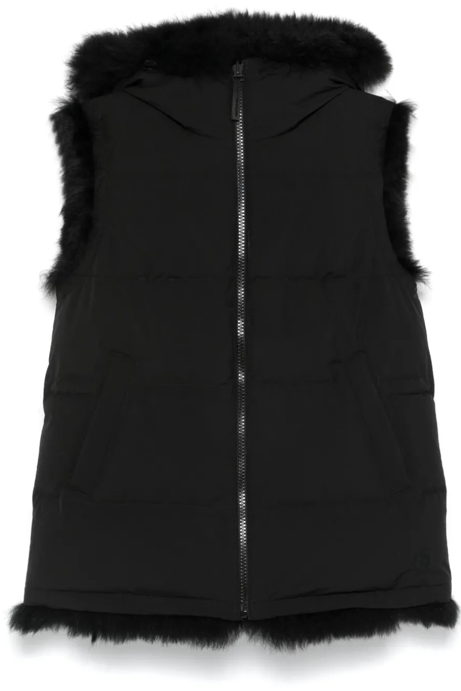 A combination of style and technical edge for this gilet that is both elegant and functional. Its technical fabric and high quality down lining have been tested to a temperature of -10°C to ensure protection against the cold. The airy texture of long-haired Merino shearling provides a sophisticated visual element as well as softness and warmth for a piece which can be worn alone, or layered over a jacket for added comfort. This reversible piece features a non-removable hood and a drawstring waist to cinch the silhouette.