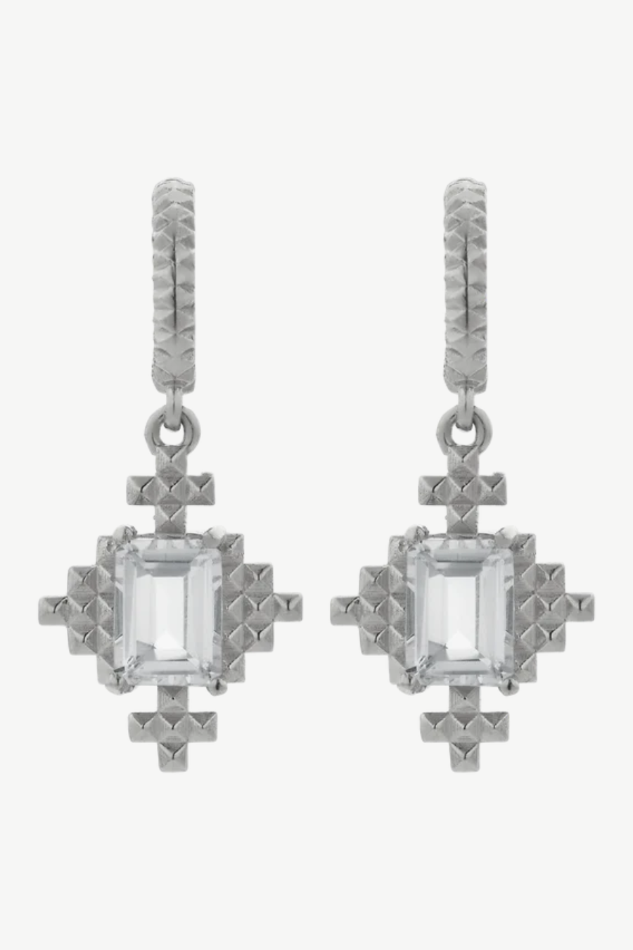 The Reya Hoops feature a beautiful baguette-cut White Topaz. This stone is held by a textured hoop that hugs the lobe and swings with soft movements.