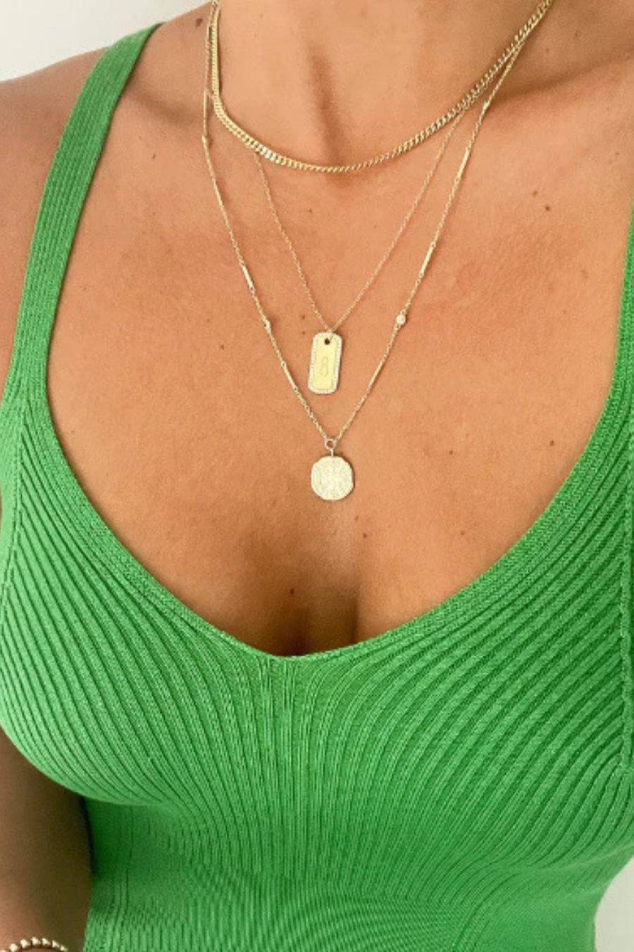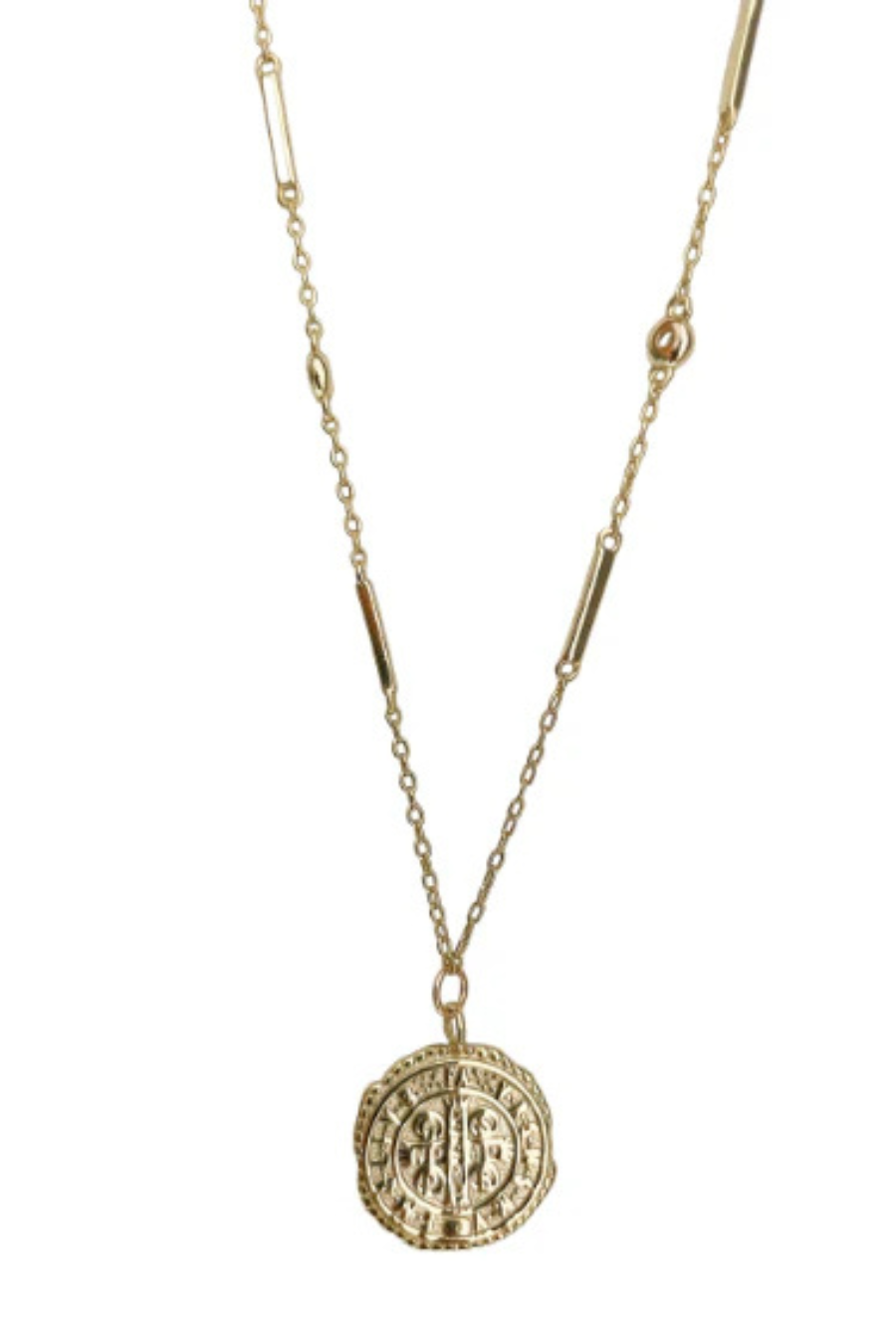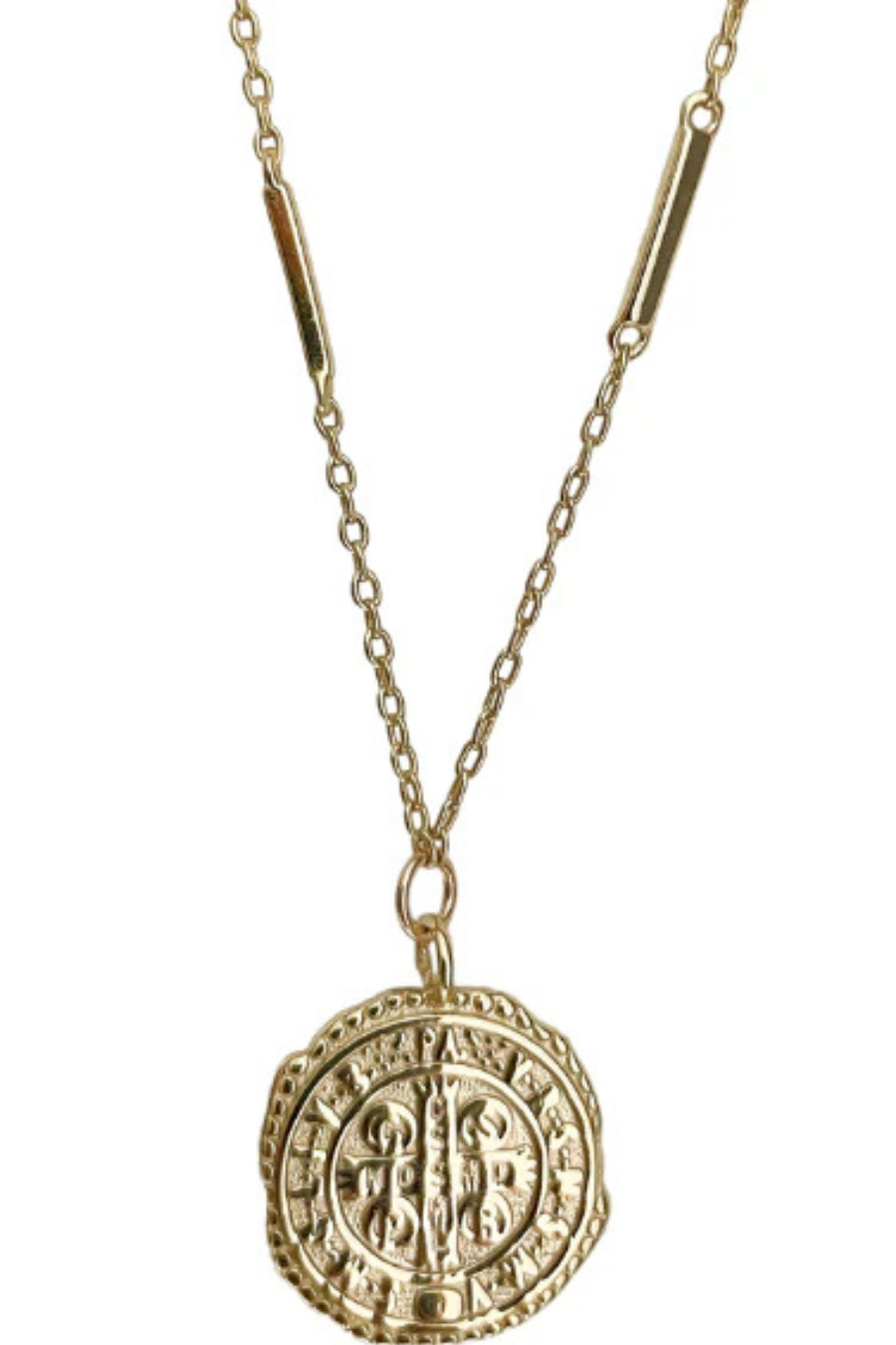 The Rome St. Benedict Coin Necklace was inspired by the historic city of Rome. A modern take on a vintage coin necklace. It has a dainty look when worn alone or can give a more edgy look layered with other necklaces.