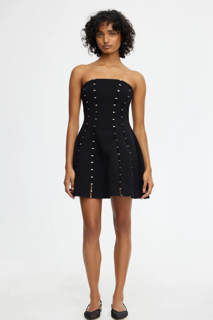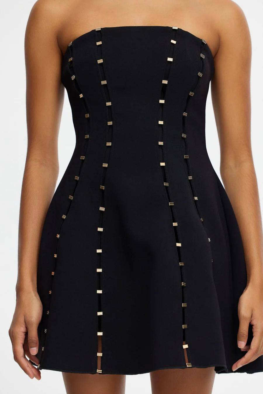A sophisticated standout ~ the Rossgreen Mini Dress in Black combines elegance with modern detail. Featuring a strapless neckline, bonded crepe fabric, and luxurious gold baby bar seam detailing. Fully lined for comfort, it includes a centre back invisible zip closure. Perfect for any occasion, this dress effortlessly exudes chic sophistication.