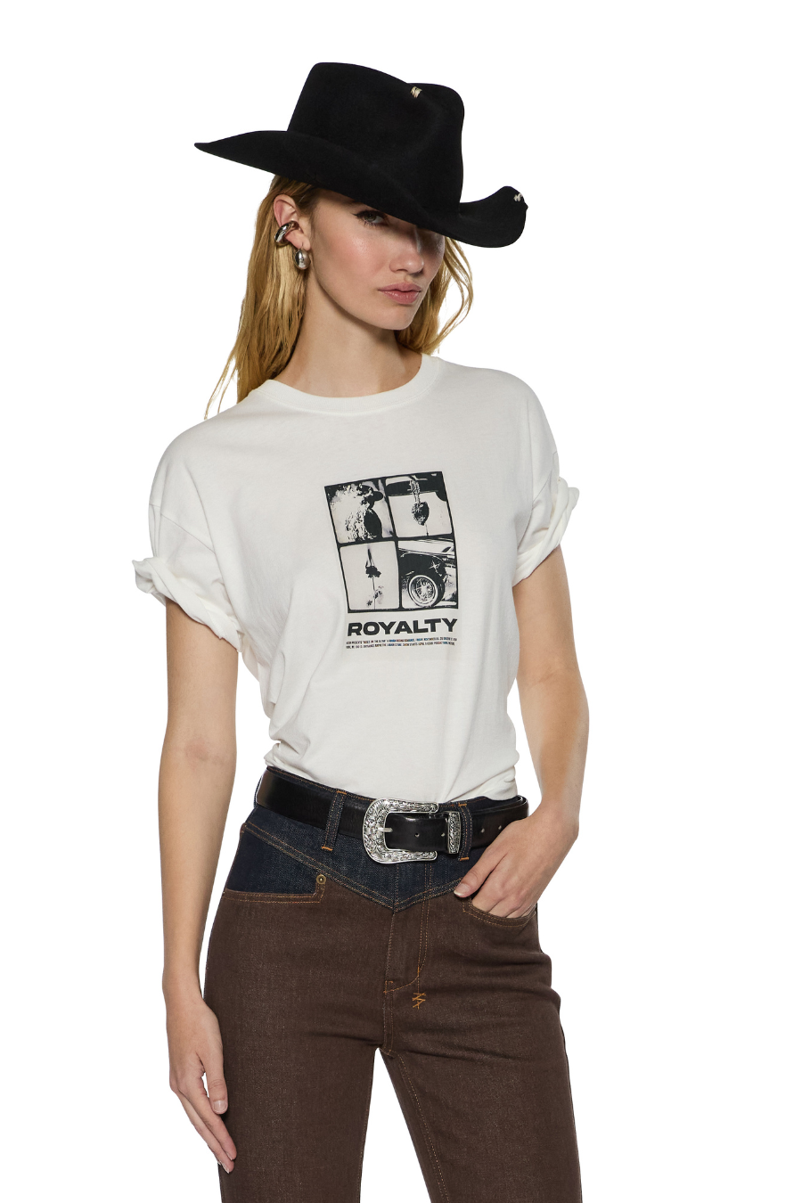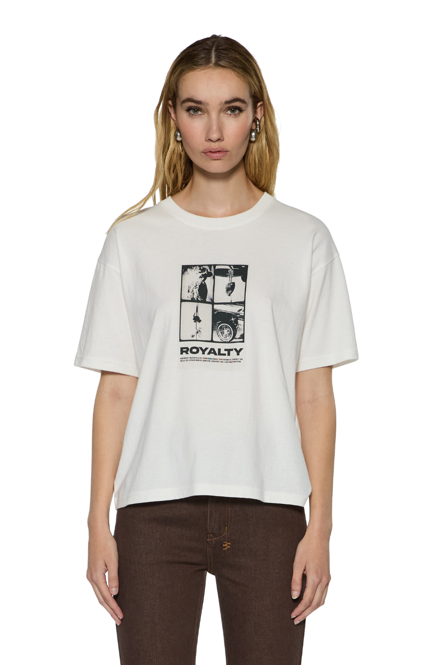 The Royalty Everyday Short Sleeve Tee Vintage White is a boxy-fit tee crafted from premium mid-weight cotton jersey, designed to sit at hip length for an effortless everyday silhouette. Finished in a soft 'Vintage White' wash, it features the exclusive Ksubi 'Royalty' graphic on the front and signature T-box embroidery for an iconic finish.