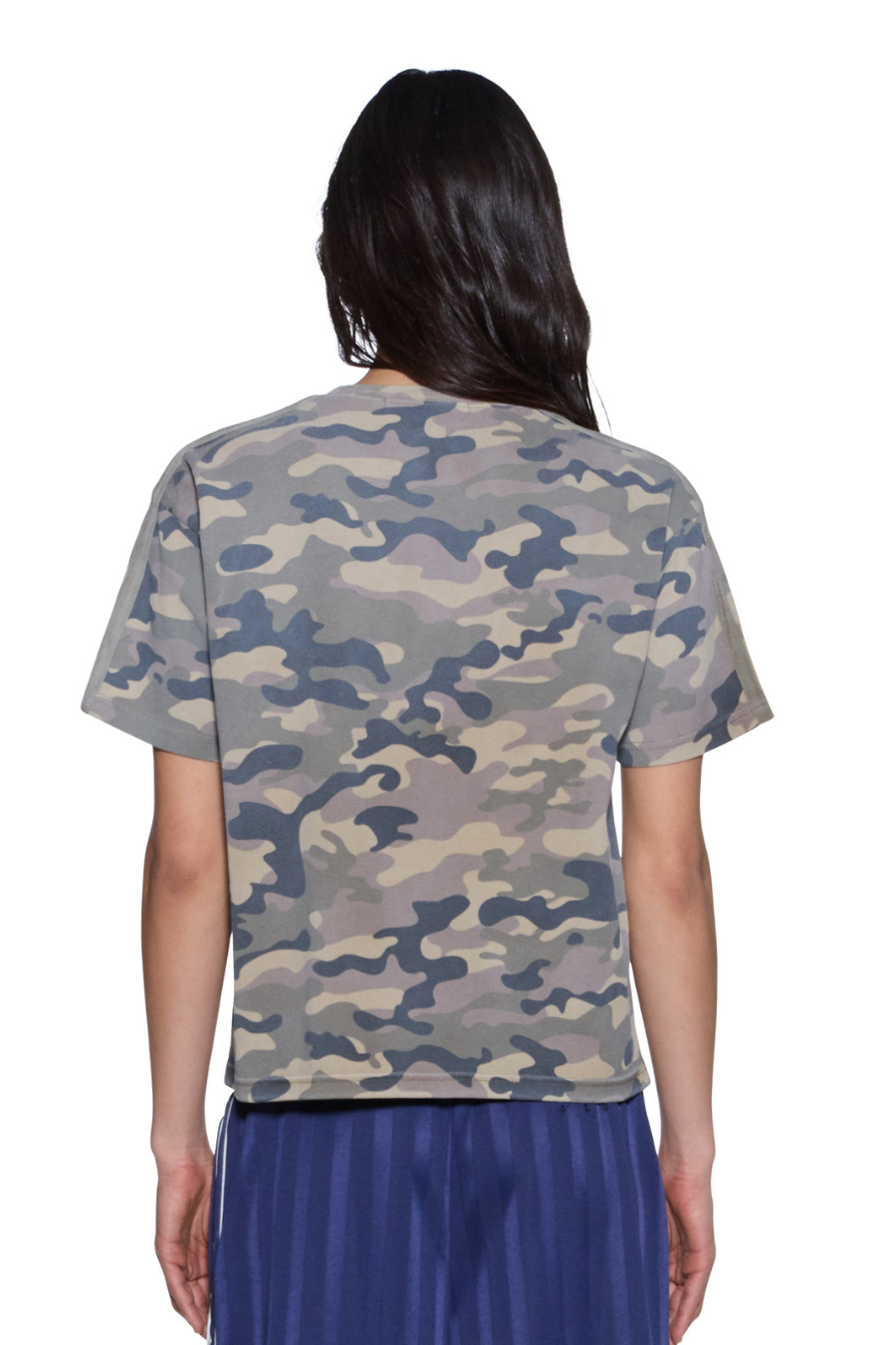 The Ruched Everyday Short Sleeve Tee Camo features a regular, boxy silhouette that sits at hip length. Made from premium mid-weight cotton jersey in a printed camo colourway with an overdyed wash, it is designed with front paneling and adjustable cords at the center front for customizable ruched styling, finished with Ksubis signature T-box embroidery.