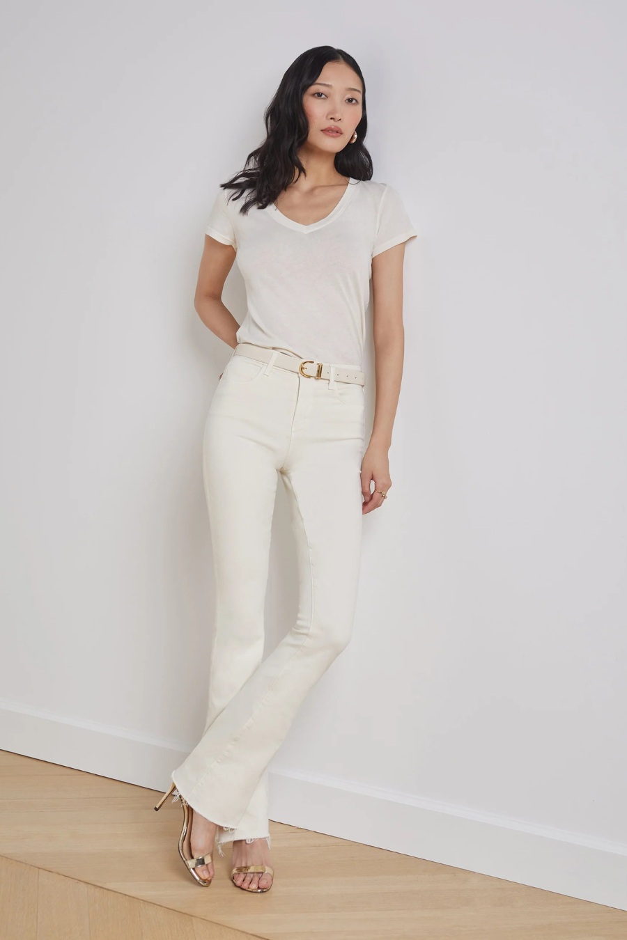 A classic high-rise jean in premium stretch denim and a vintage-white hue. With a flattering contoured waistband, style is fitted through hip and thigh before falling in a straight, slim leg to a clean raw hem. Includes 5-pocket construction and front zip fly closure.