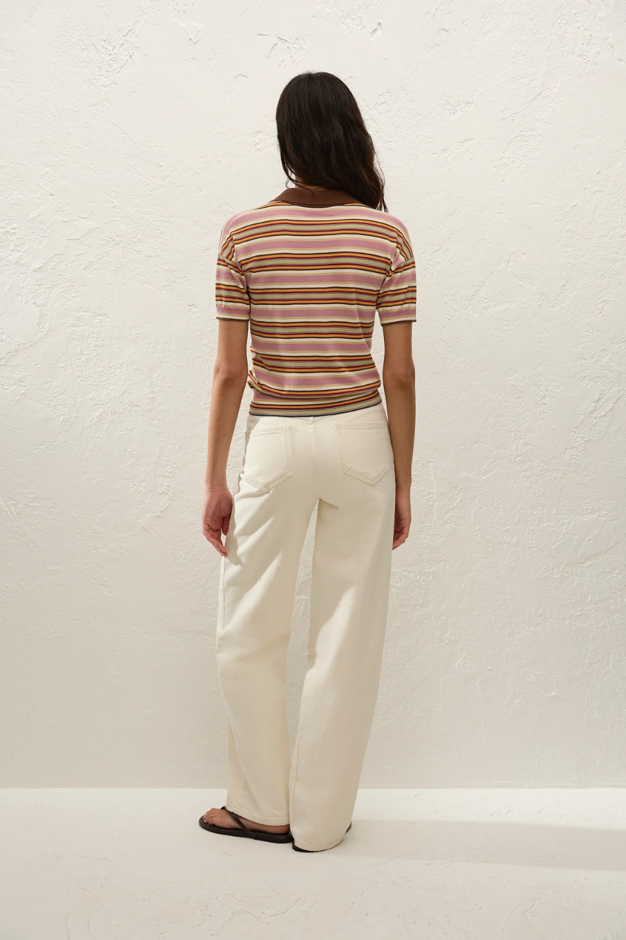 A polo-inspired top designed from a signature true knitwear fabrication in a warm multi-colour stripe, bringing in tones of mauve, olive and chocolate brown. With a classic collar and button-up V-neckline, it features short sleeves and a relaxed silhouette. There is a ribbed band around the sleeves and hem for a slight cinching. Style over a simple trouser for elevated everyday wear.