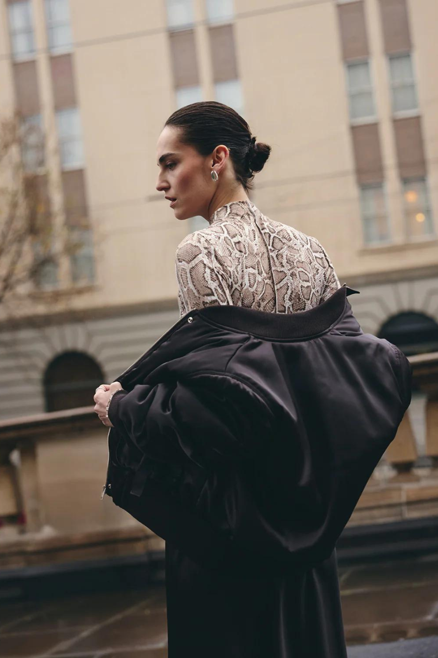 It's designed for a slim fit with exposed stitching on the seam, and it features a high mock neck.