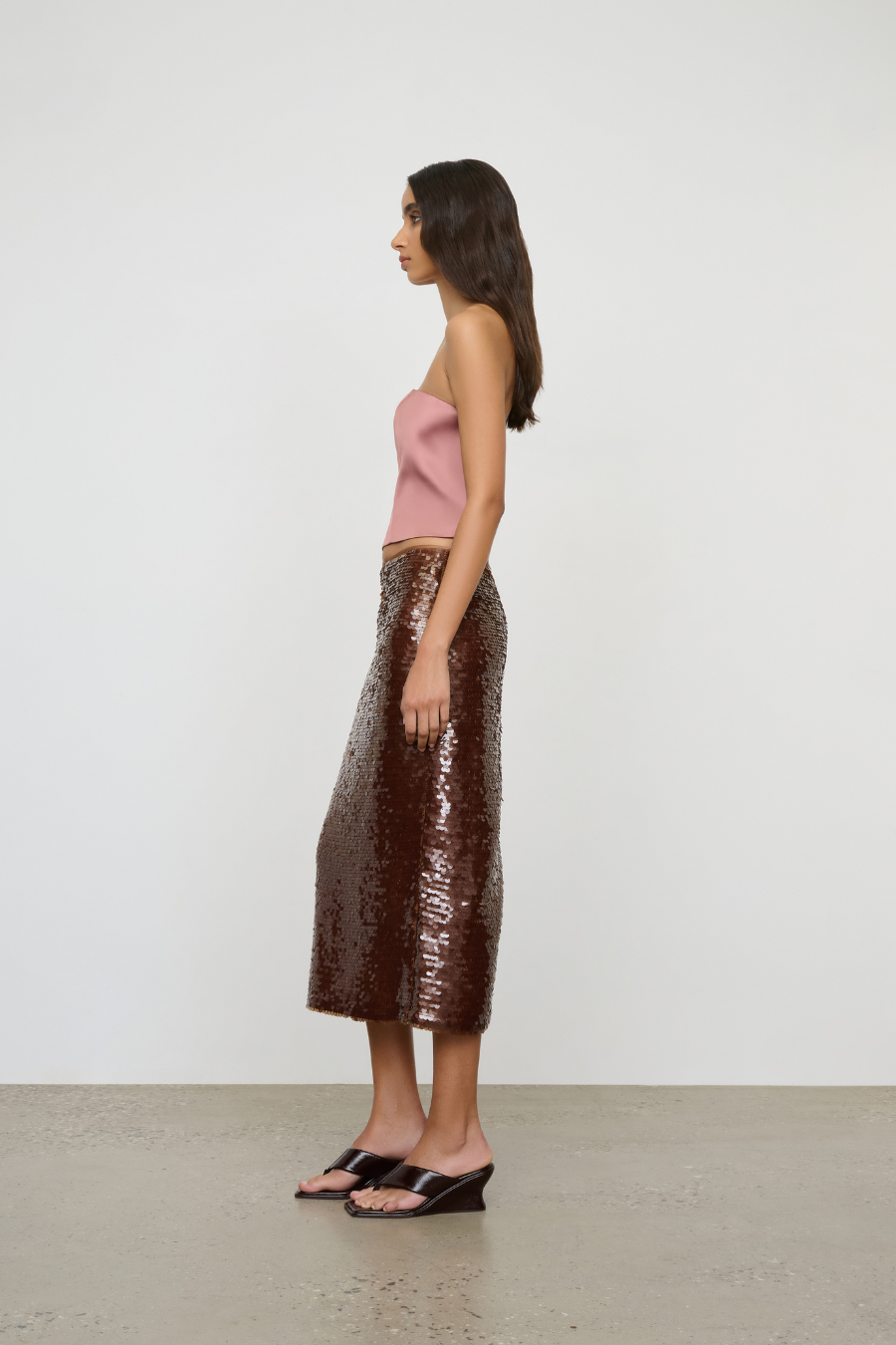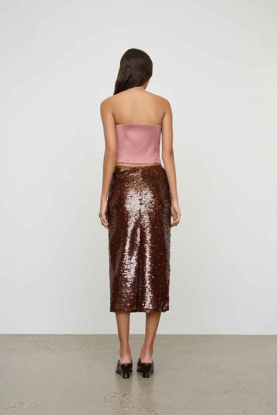 A strapless bustier crafted in a high shine satin bonded onto a heavyweight crepe.
