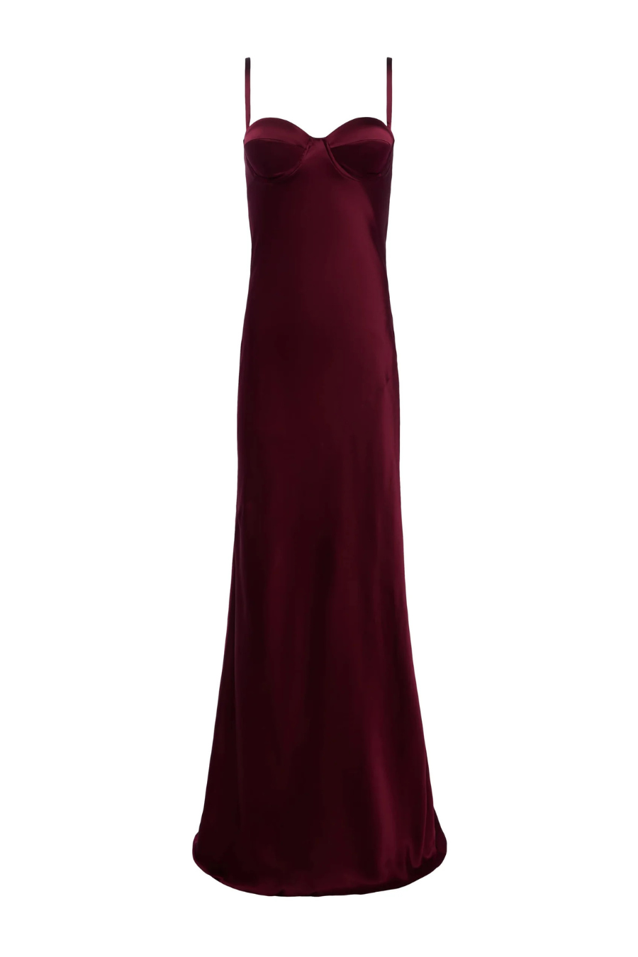 This style was featured in our Fall '25 NYFW presentation. The Sayla silk gown melds vintage glamour and modern sophistication. Constructed with molded cups secured by a traditional hook and eye closure, this event-ready style offers a secure, supportive fit. Now in rich dark port.