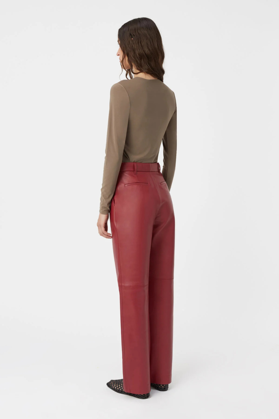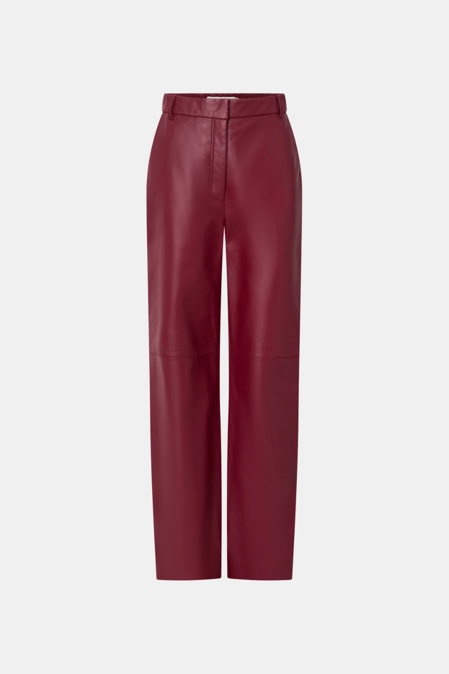 The Selita Leather Pant is a refined wardrobe essential, crafted from supple leather with precise horizontal seam detailing for a contemporary edge. Designed to sit high on the waist, it features practical belt loops and a half-lined interior for added comfort and structure. This timeless design effortlessly blends modern femininity with classic tailoring, making it a versatile choice for any occasion.