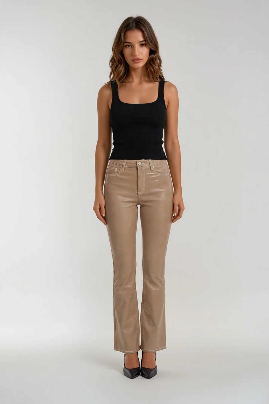 A sleek, slim bootcut, fitted through the hips and knee. A contoured waistband securely hugs the natural waist without gaping.