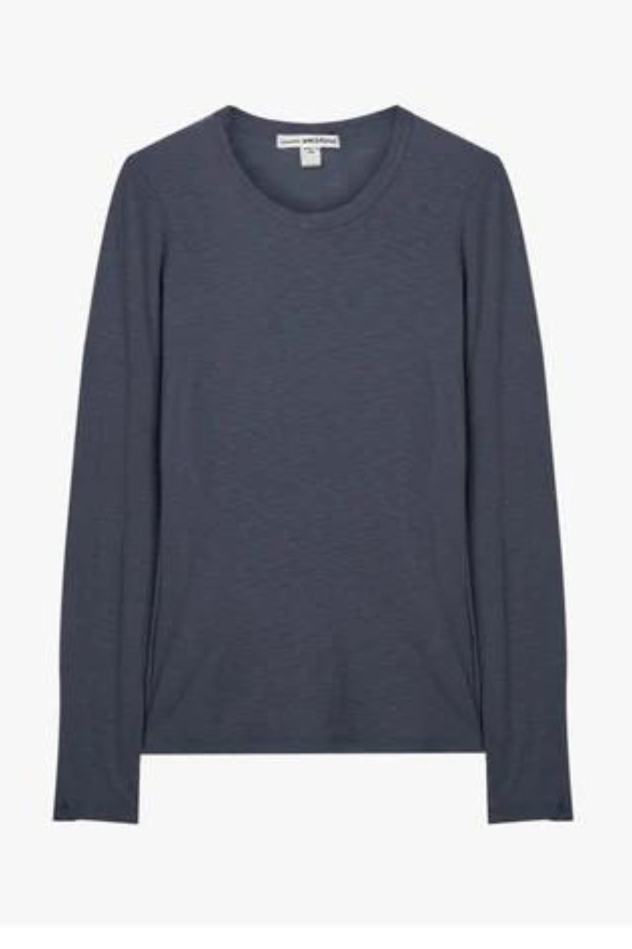 James Perse Long Sleeve Crew Neck Tee with single fold, bound crew neckline. A key style in our classic collection, the Sheer Slub Long Sleeve Crew is made from our cotton slub fabric (UA) allowing for ease and comfort. Reverse side of the fabric has been used on the exterior of the garment for added texture and dimension. Details include full length sleeves with coverstitched bottom hem. This t-shirt fits close to the body.