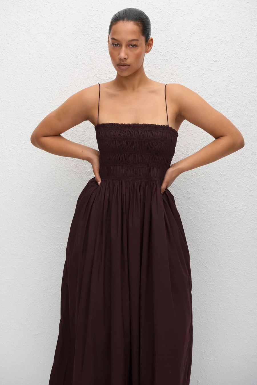 A classic and easy pull-on dress with delicate shoulder straps and repeated double elastic shirred detailing throughout the bodice. Made from our organic cotton poplin, this mid-length style features a self-lined bodice, and is complete with side pockets.