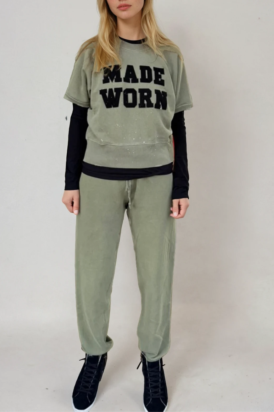 The garment is cut, sewn, distressed, and finished entirely by hand in los angeles, california. due to this handcrafted process, every piece is completely unique and one of a kind.