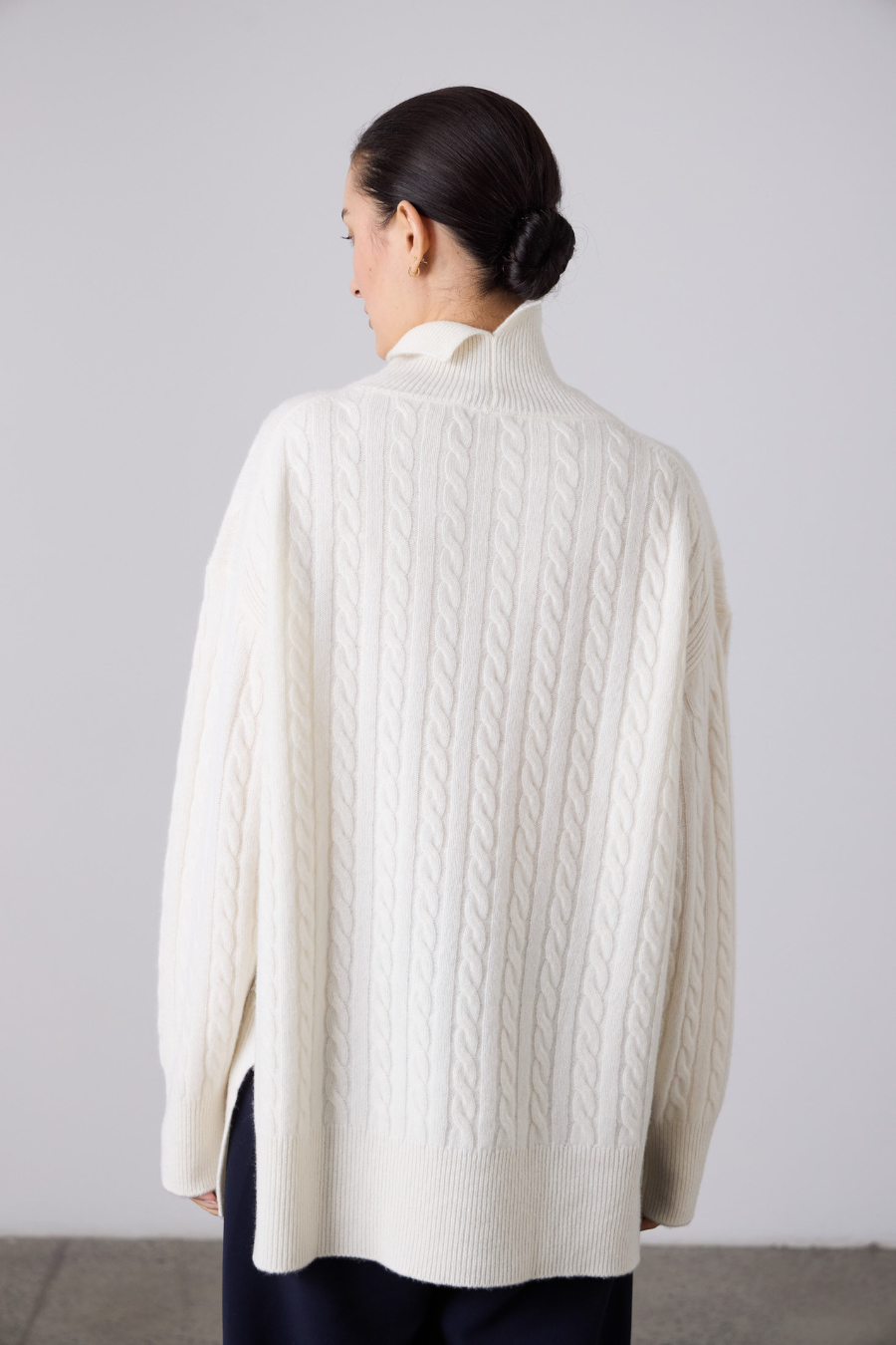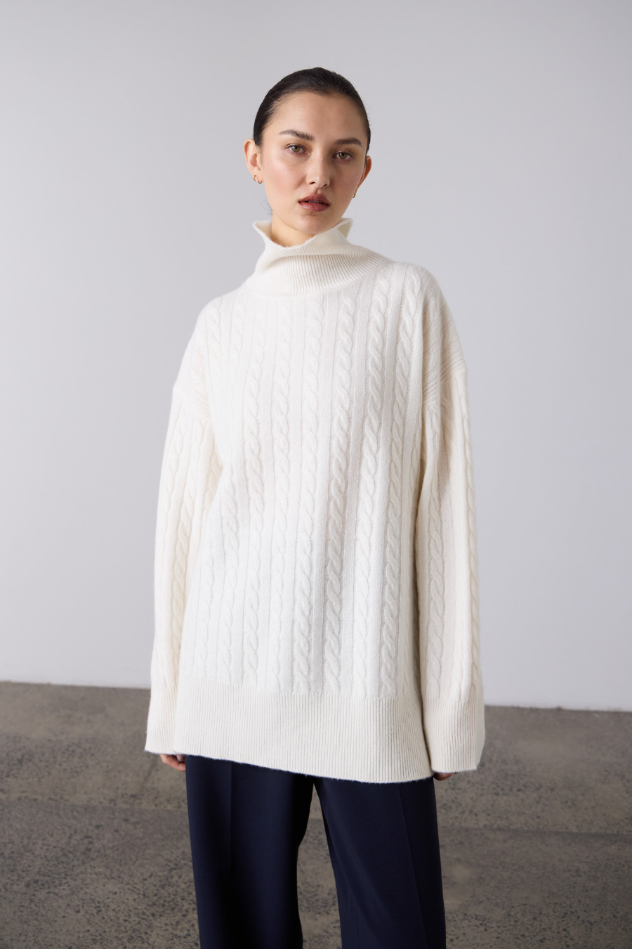 A stylish slouchy cable knit is a must-have in any woman's wardrobe. Pair it with a bold skirt, your favourite jeans, or slim trousers for a cozy yet chic look. We love the luxurious feeling of this style in winter white.