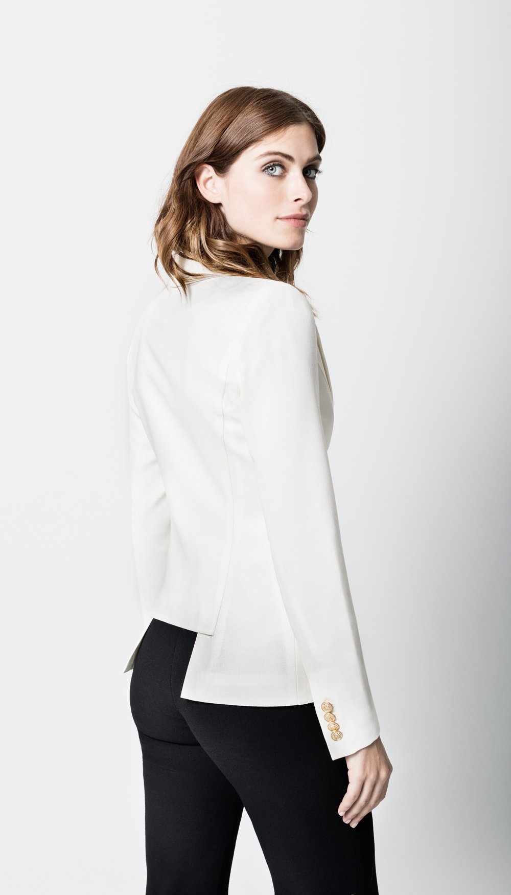 Decidedly tailored and one of our top selling silhouettes, this single breasted blazer features a “cheeky” cut out back vent and brass hardware.