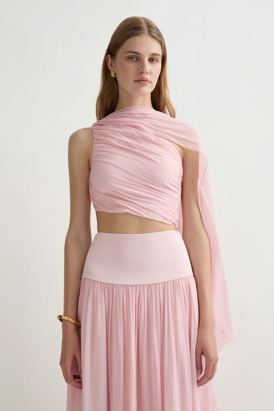 The Solene Top is designed with an elegant one-shoulder silhouette and features a gathered bodice with a versatile shoulder scarf that can be styled multiple ways. Wear yours as a set with the Solene Skirt.