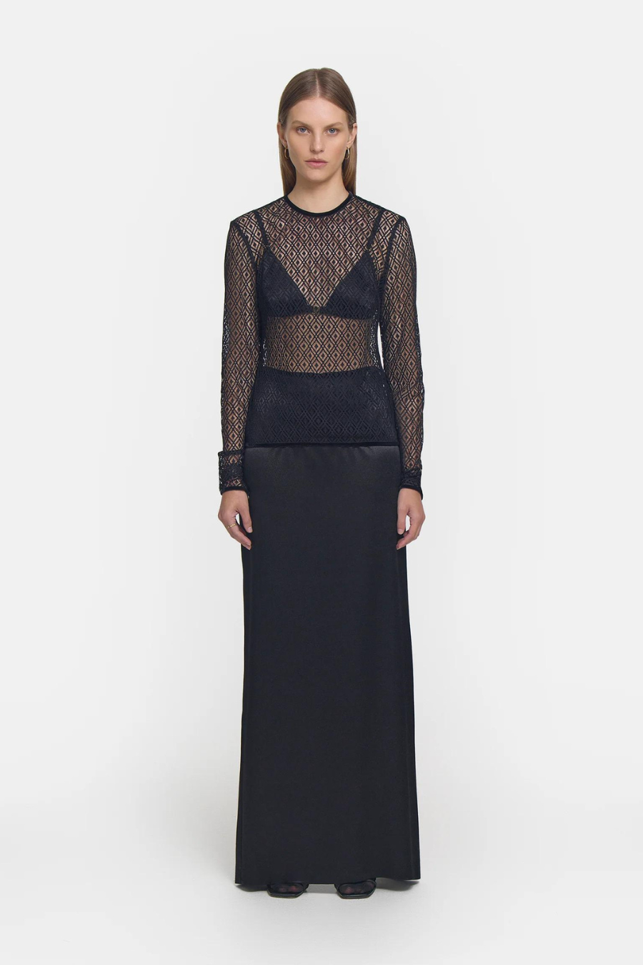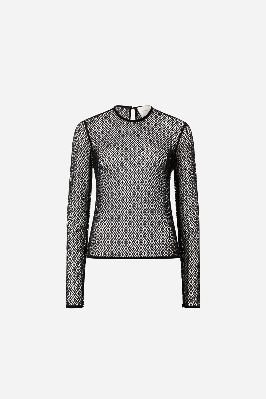 Enhance your ensemble with the Spielberg Top, featuring intricate black lace and luxurious velvet binding. This high-necked piece exudes refined sophistication, offering an elevated touch to your wardrobe. Perfect for layering or as a standalone statement, it adds a captivating element to any outfit.