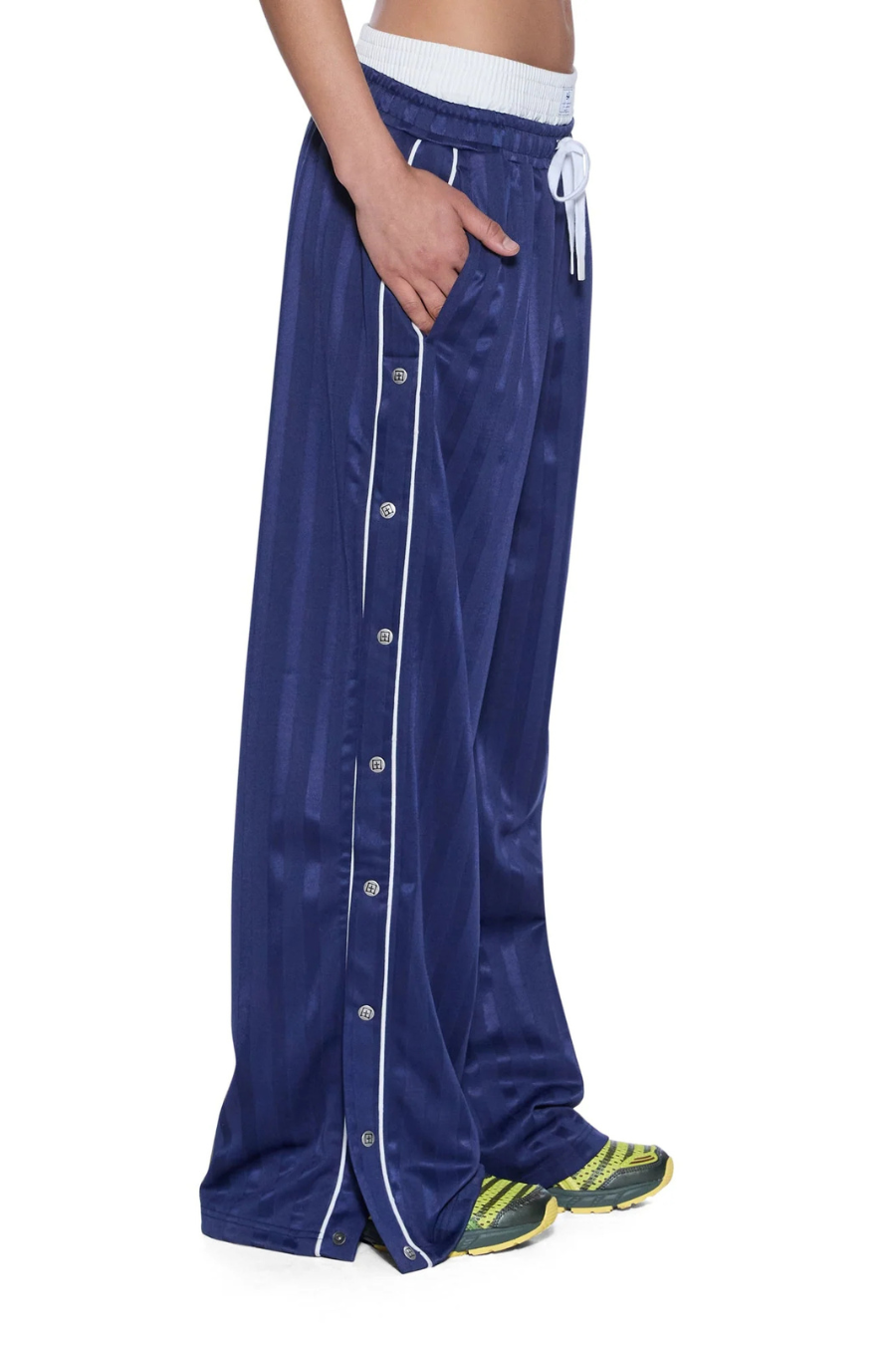 The Stacked Origin Trakpant Navy is a mid-rise, wide-leg track pant with an elasticated waistband and drawcord. Made from premium jacquard stripe jersey, it features contrast piping along the side seams, snap-button side panels with welt pocket detailing, and a built-in contrast double-layer boxer short in heavyweight Oxford cotton.