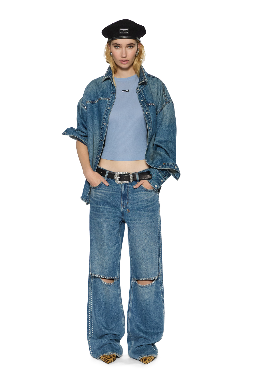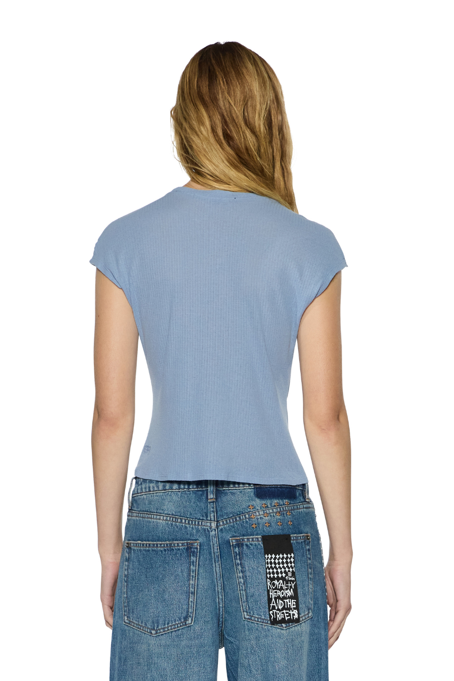 The Staple Ss Tee Ice Blue Sheer is a slim fit mock neck cap sleeve tee crafted from premium sheer rib cotton in a seasonal Ice Blue tone. It's finished with a woven SOTT label on the front and Ksubi T-box embroidery, ideal for layering or styling back with Ksubi denim.