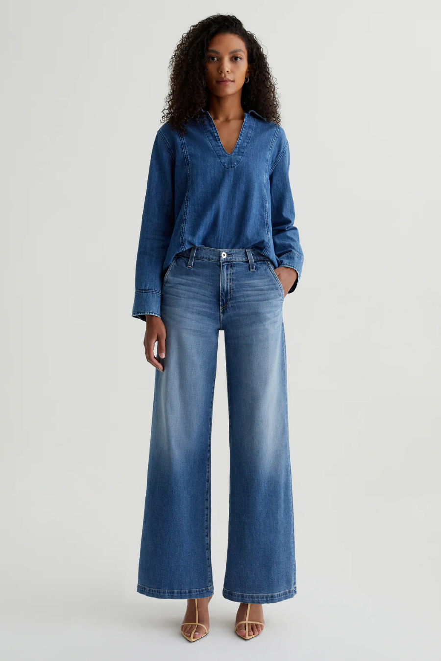 Stella is a low-slung denim palazzo pant in a medium indigo wash with a faded finish. Designed to be worn lower on the waist, the style has trouser-inspired slant pockets and a super-wide cut through the legs. This pair features 10 oz. Daytripper Stretch Denim that's soft, lightweight, and comfortable.