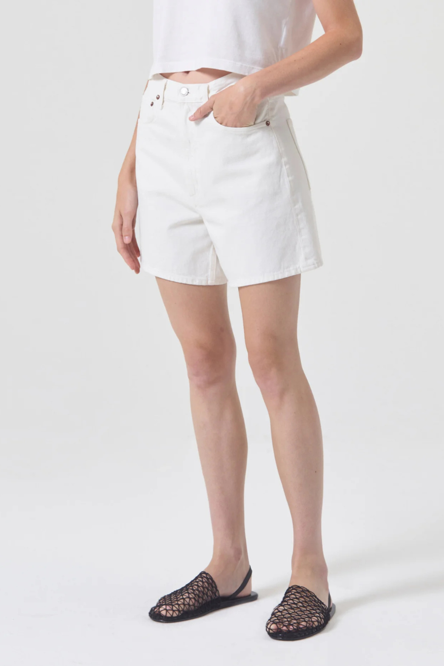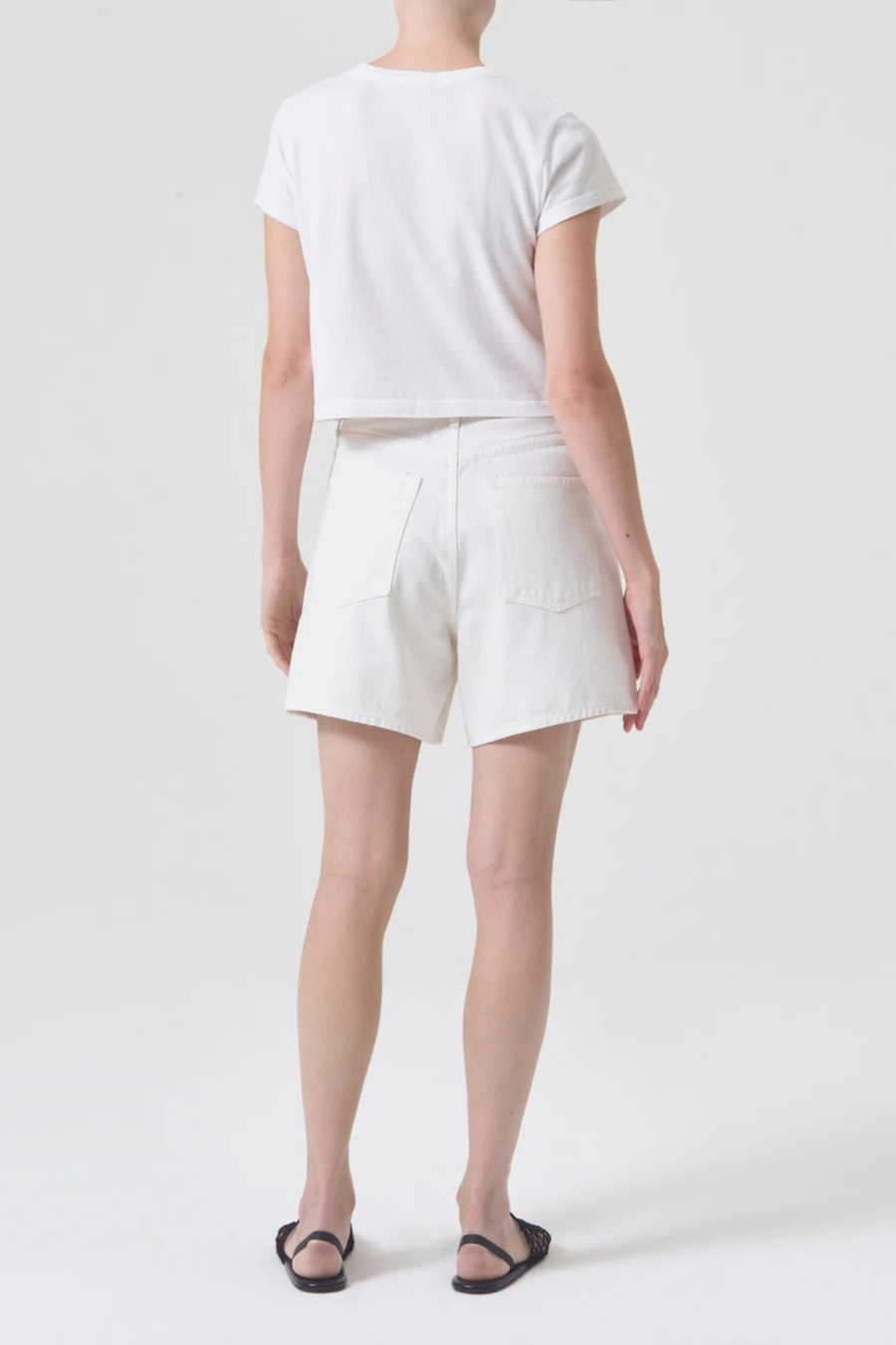 Relaxed fit shorts, cut from a rigid cotton denim. Featuring a high rise, wide legs with slightly longer in-seam, finished hem, zip fly, and classic 5 pocket detailing.