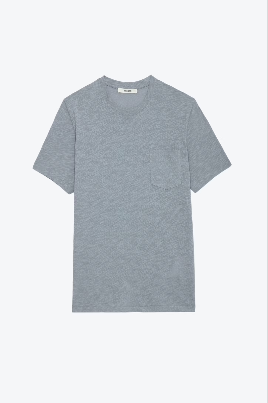 Mens grey slub cotton t-shirt with short sleeves, pocket and Skull Block pattern on the back.