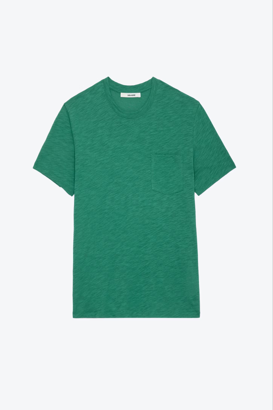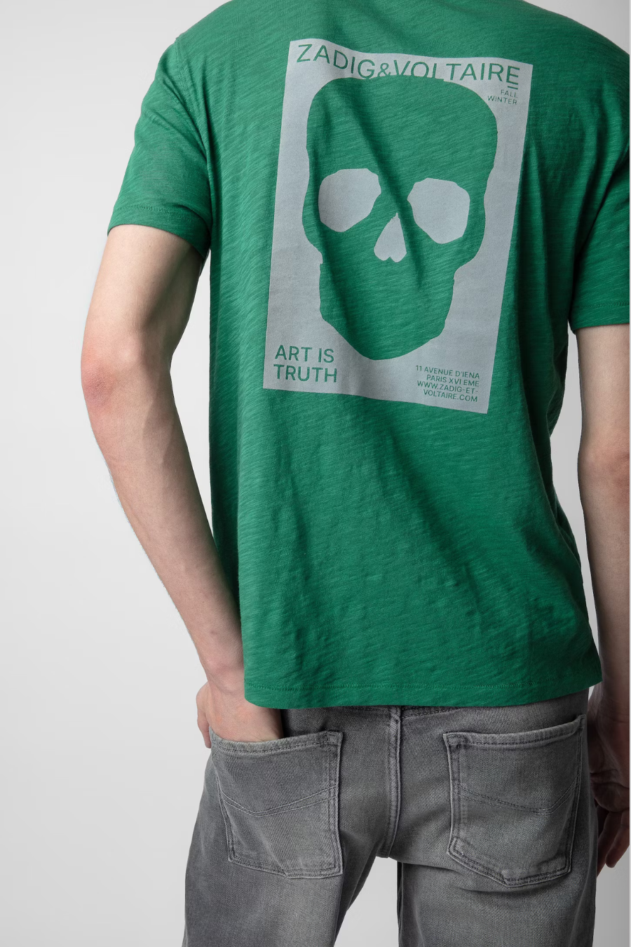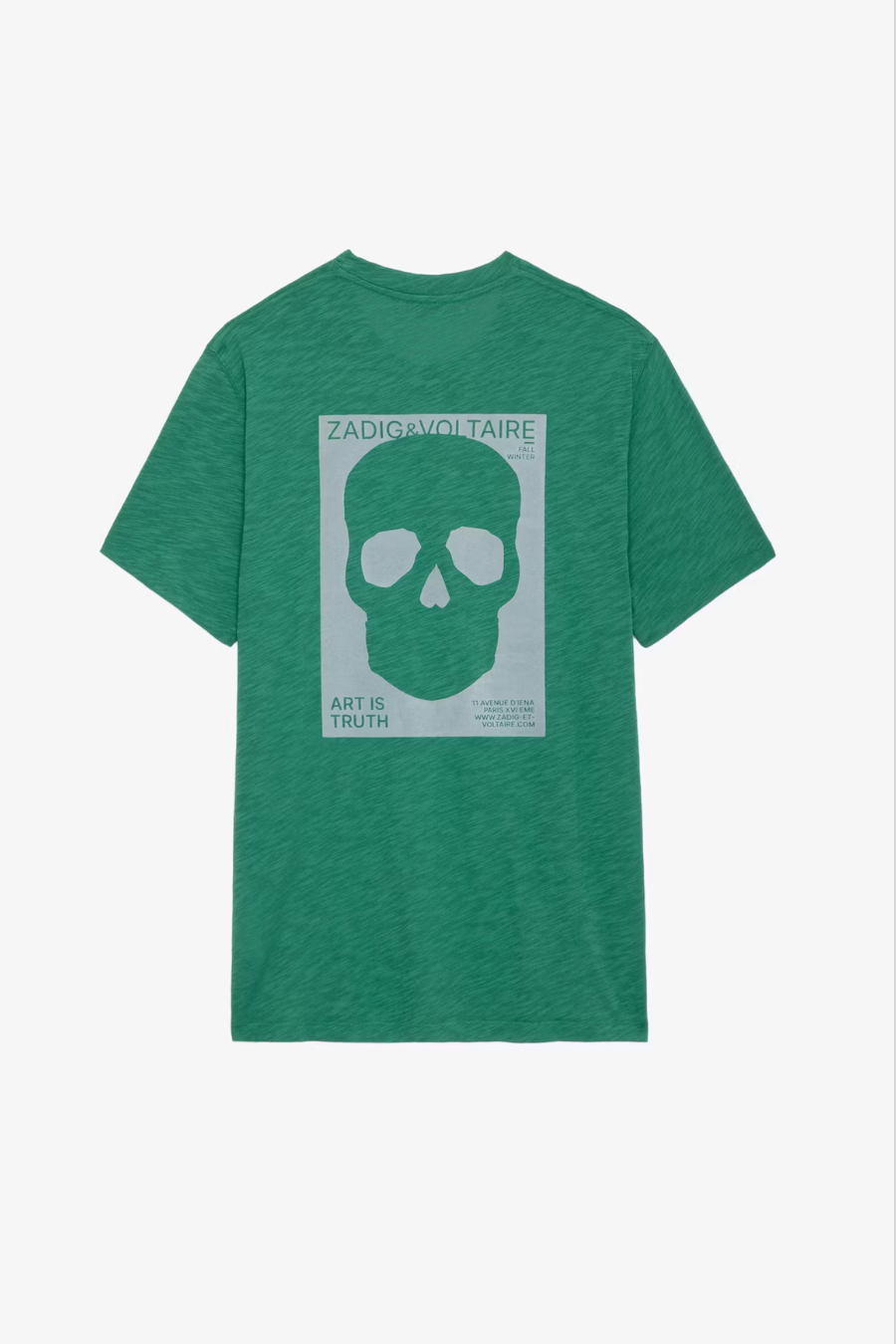 Mens green slub cotton t-shirt with short sleeves, pocket and Skull Block pattern on the back.