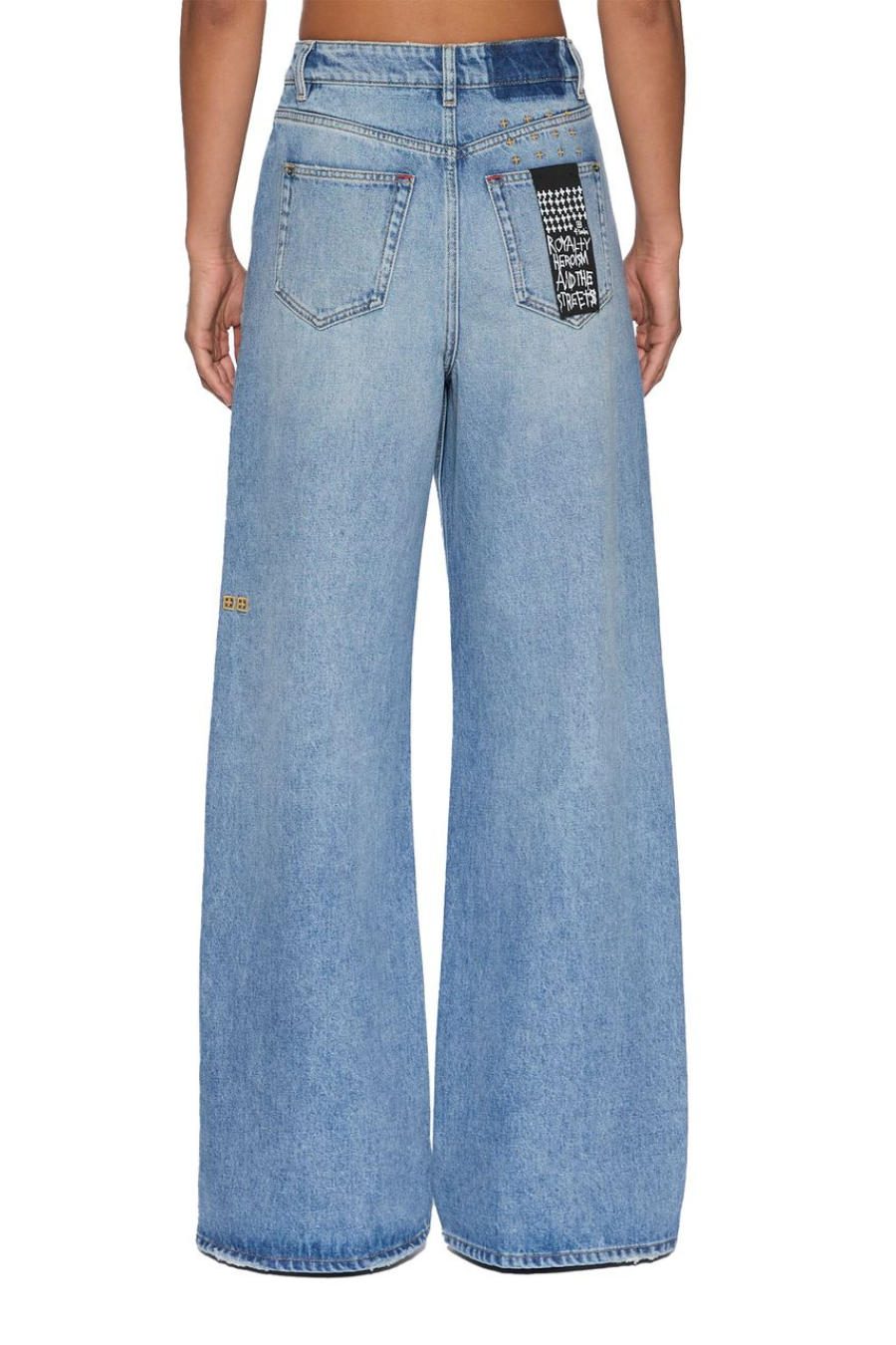 This wide leg jean sits at a full length creating a flattering silhouette and can be styled with heels or cuffed with sneakers. The super high-rise style features hotfix stud detail along front pocket scoops and waistband with matching metal 3x4 branding.