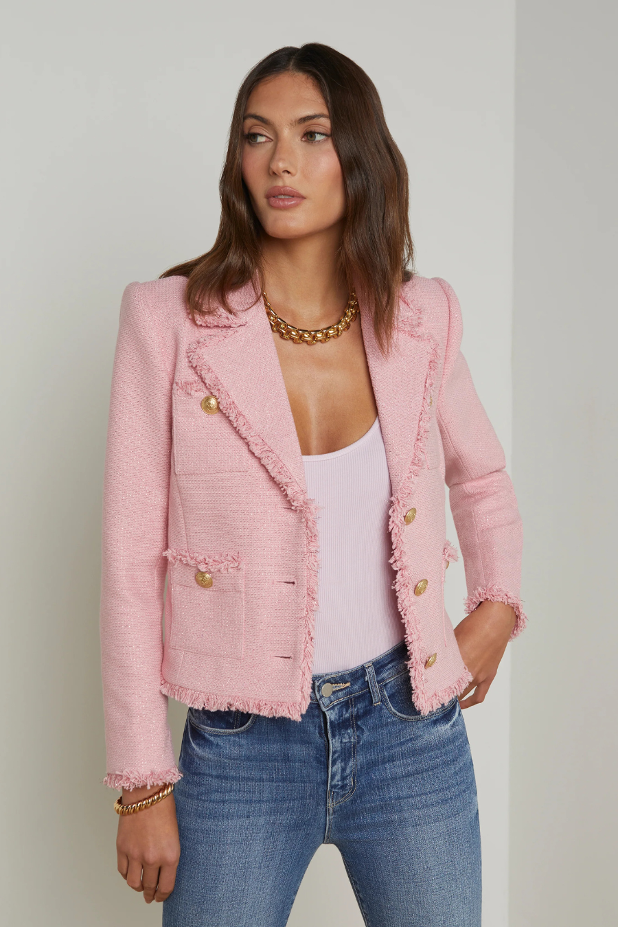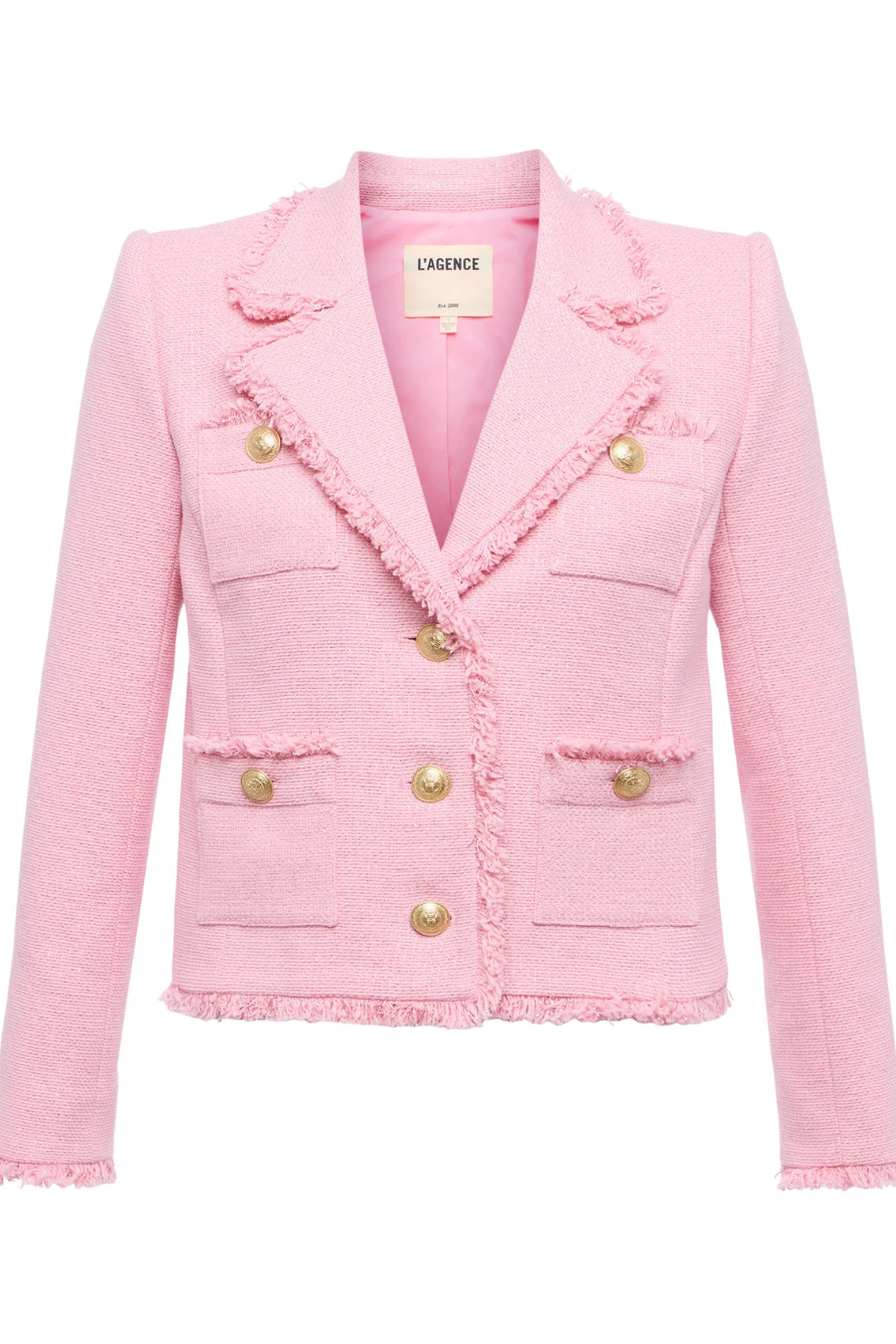 The Sylvia Collared Jacket in Pale Pink Gold from L'AGENCE exudes modern elegance with its sleek, tailored fit and luxe finish. Crafted from a soft, lustrous fabric in a subtle pale pink hue with gold detailing, this jacket features sharp lapels and a structured silhouette that flatters the body. Versatile and chic, it’s designed to seamlessly elevate both day and evening looks, making it a must-have addition to your wardrobe.