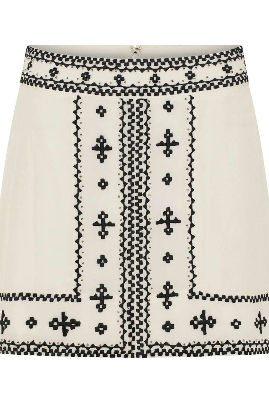 The Tempe Skirt is a mini-length statement piece, crafted from luxurious white silk crepe and adorned with intricate black embroidery. Detailing graces the waist, hem, and runs down the centre, creating a harmonious balance of artisanal craftsmanship and modern elegance. Lightweight and refined, the Tempe Skirt pairs beautifully with the Sirius Blouse or the Oracle Top.
