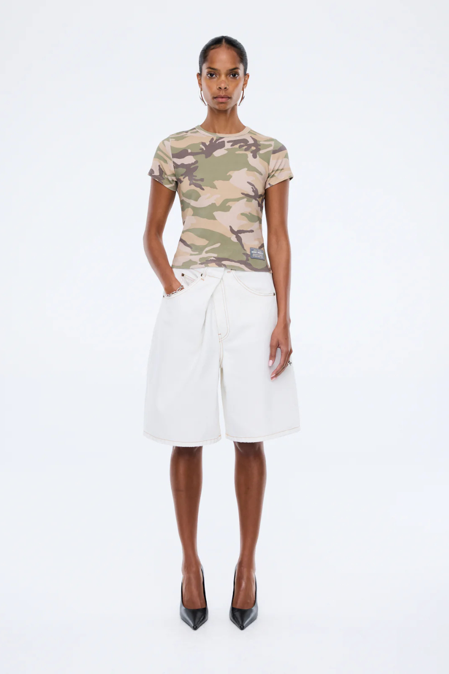 The Tessa Baby Tee in desert camo print is crafted from bay rib cotton, in a fitted crop baby tee style. It is close fitting, designed with Ena Pelly branded badge and cap sleeve.