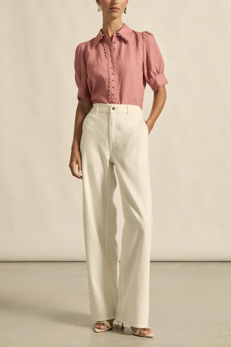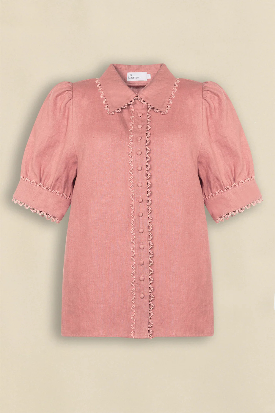 - scallop lace trim along placket, collar and cuffs