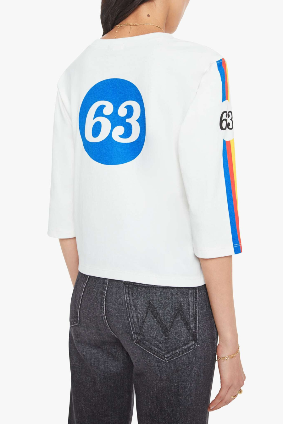 Need for speed. A crewneck tee with elbow-length sleeves and a loose, boxy fit. Made from 100% cotton, The Better Half in MOTHER 63 features colorful stripes across the chest, MOTHER's name in black on the front and a Vespa-inspired 63 graphic on the back.