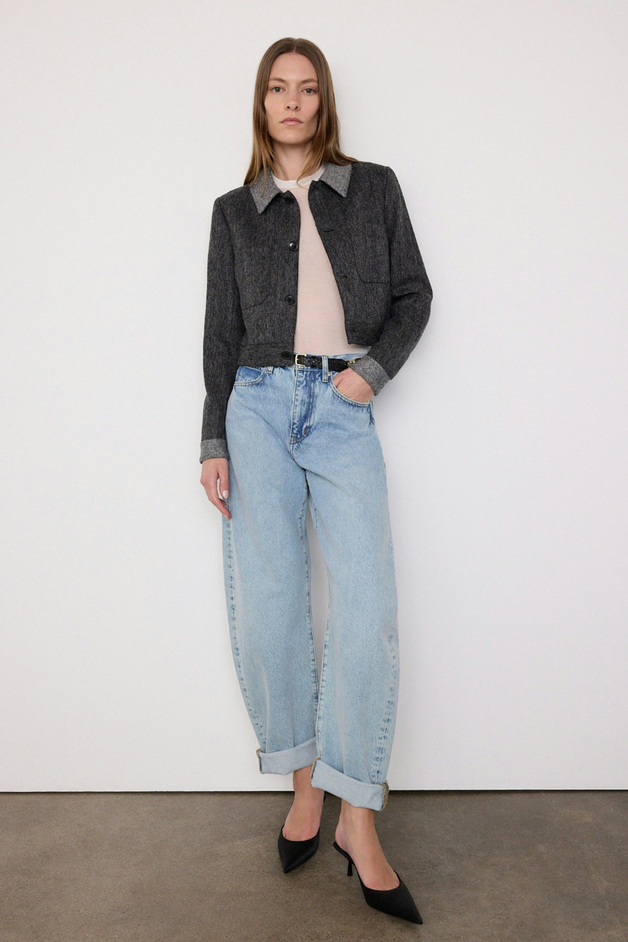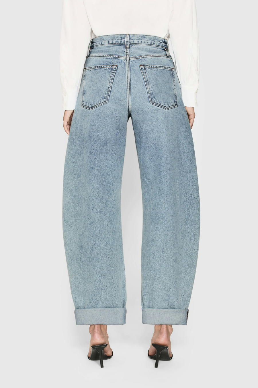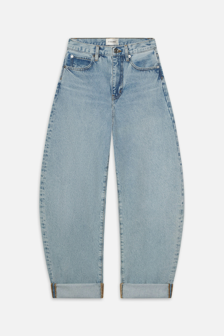 An exaggerated take on the trending barrel silhouette, this unique fit is your new closet necessity. With a flattering high rise, these jeans feature a curved outseam for a playful bubble effect. Designed to be worn cuffed and hit at the ankle, the 2.5" twice-rolled cuff can be unrolled for a longer, more dramatic inseam.