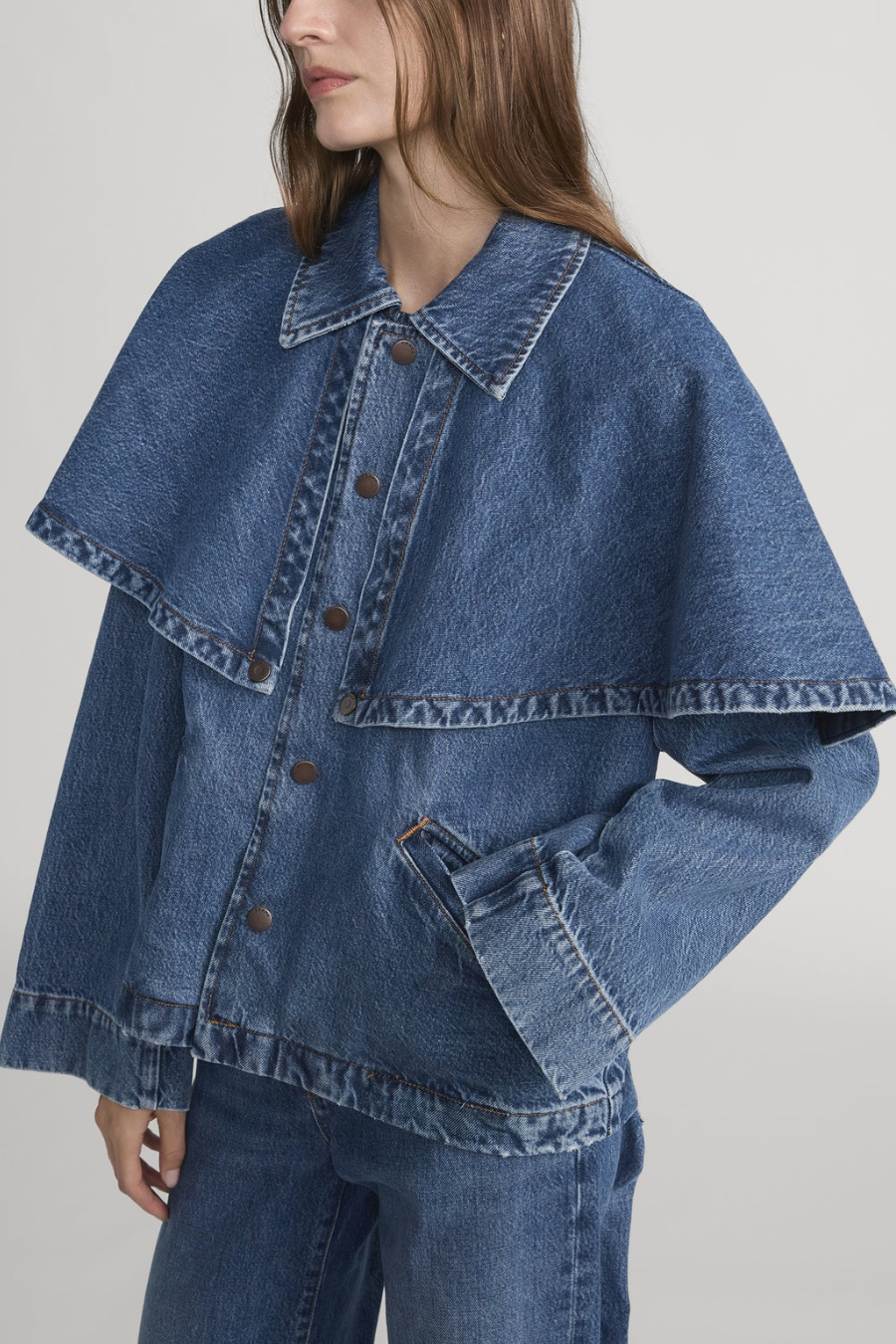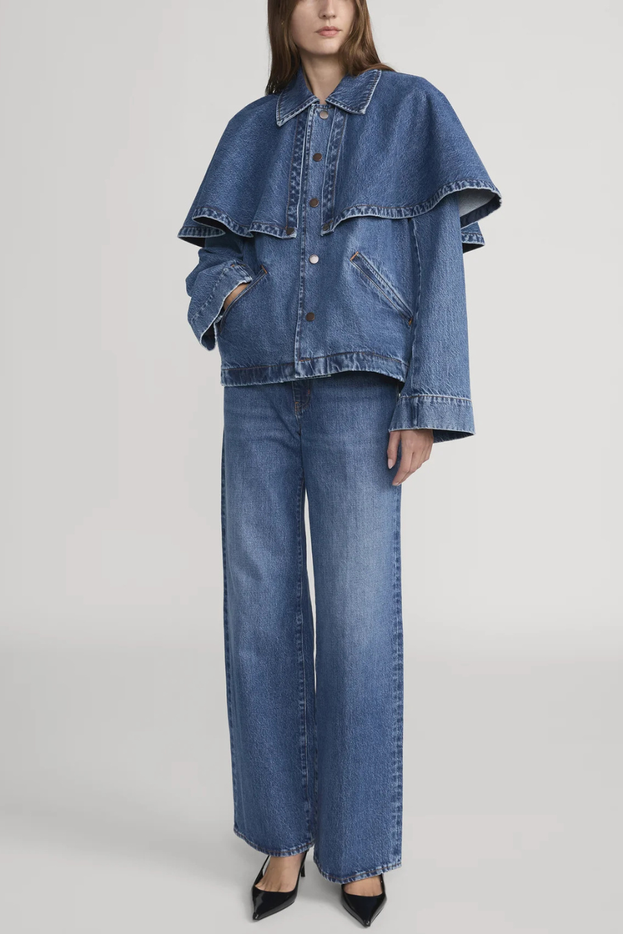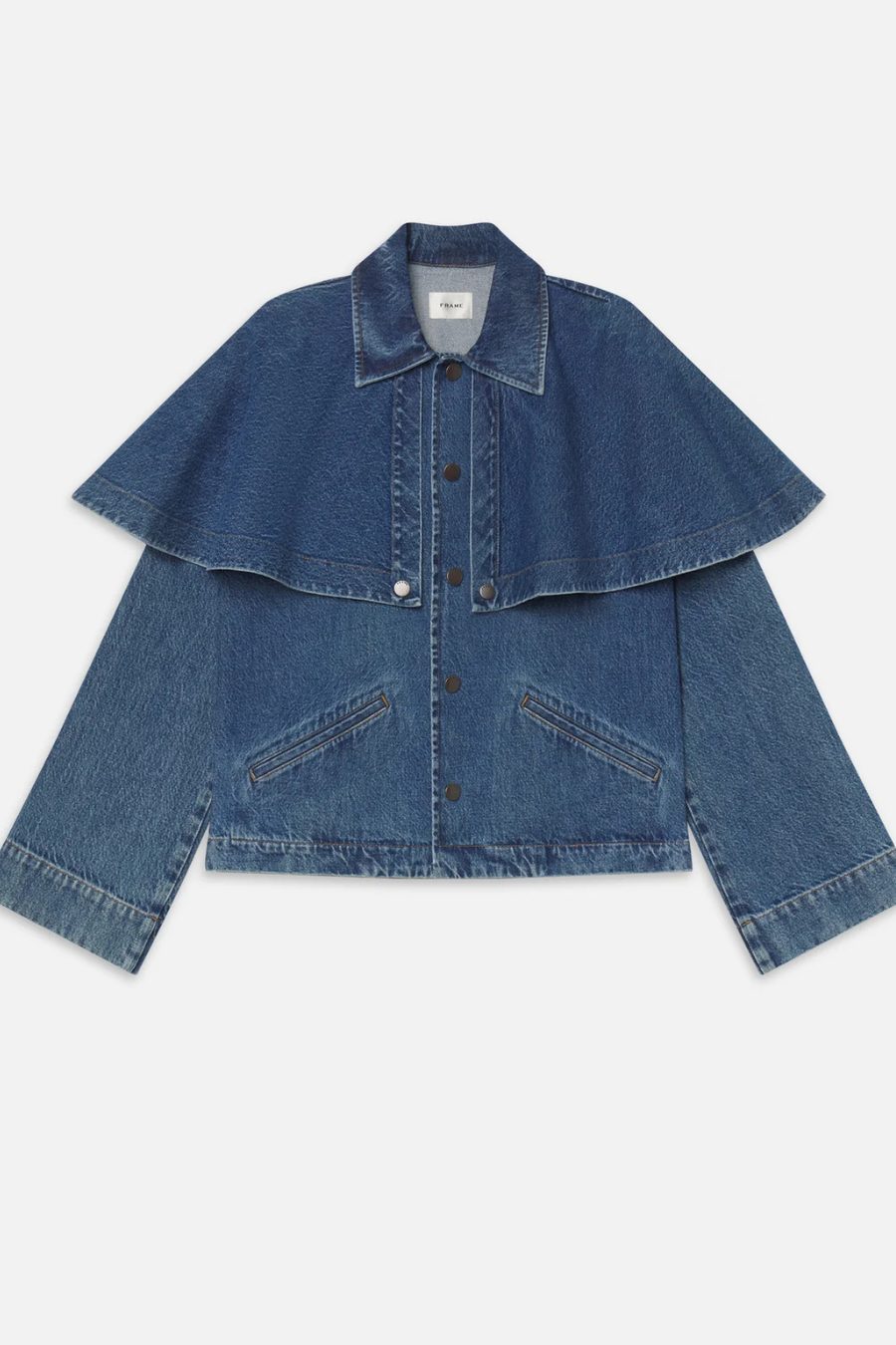 This hip-length denim jacket is defined by an attached cape and bell sleeves. Finished with copper snaps and welt pockets.