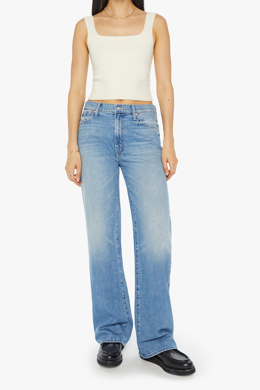 Living for the moment. Designed to sit on the hips with a slouchy fit, a loose straight leg and a 32-inch inseam with a clean hem. Made from semi-rigid SUPERIOR denim, Tomorrow Never Knows is a light-blue wash with subtle whiskering and fading at the knee.