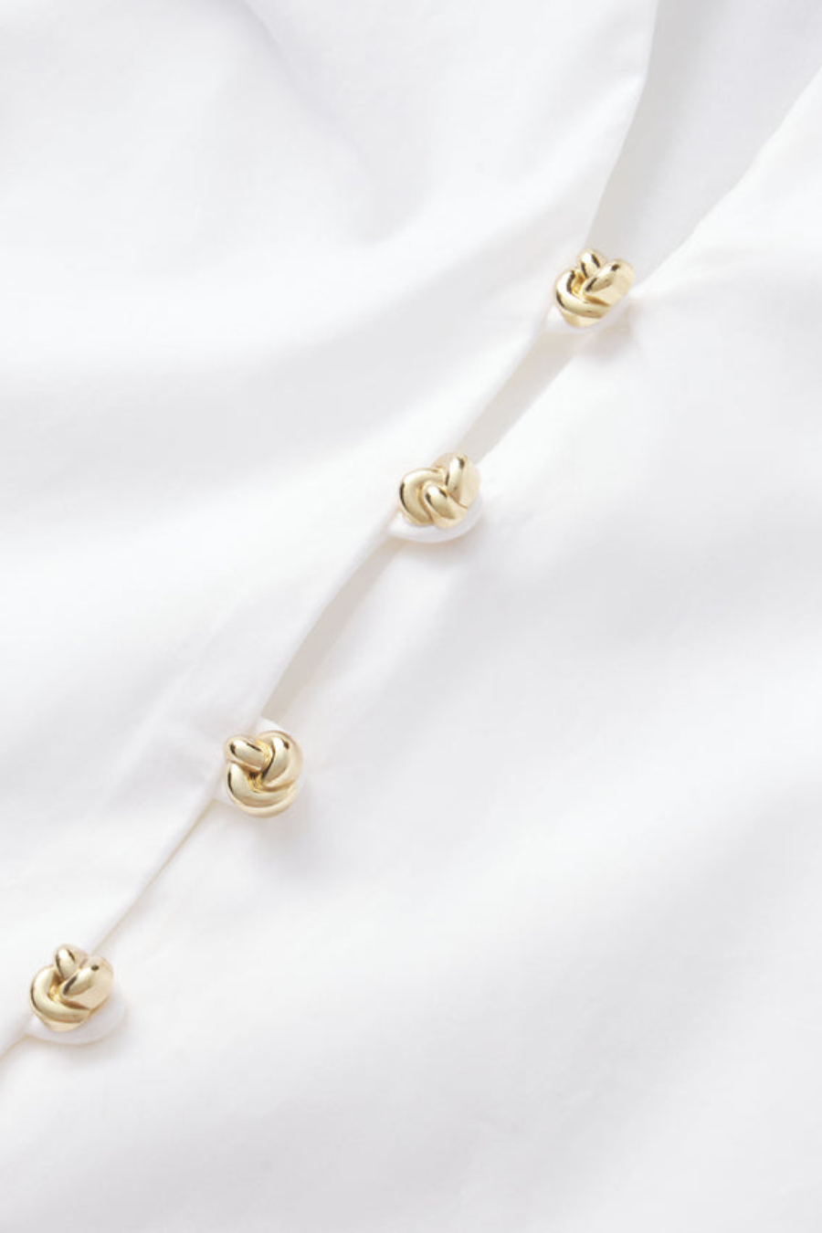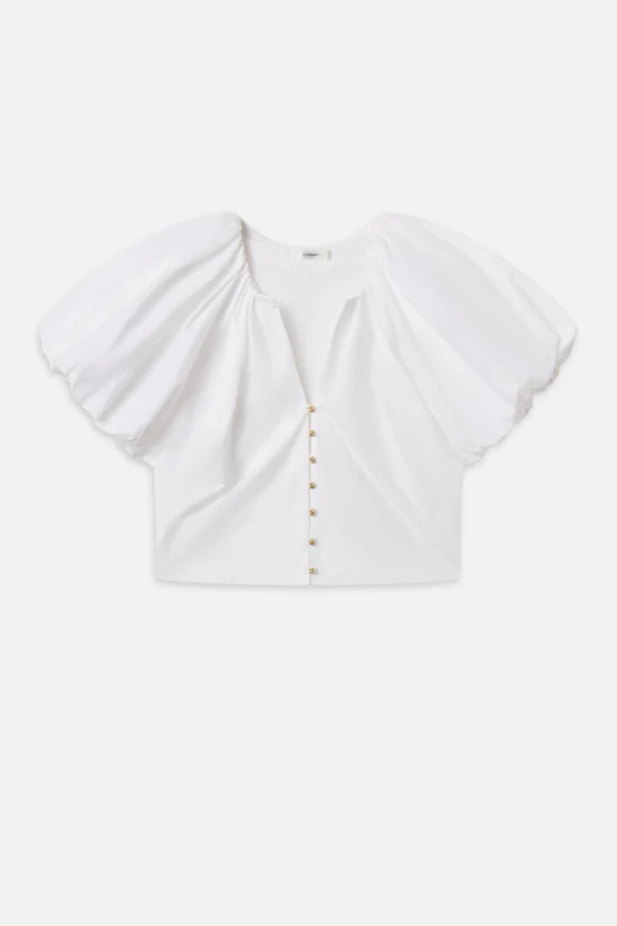 The Dramatic Sleeve Blouse is crafted from 100% organic cotton and designed with a sculptural bubble sleeve, mini gold knot buttons, and a soft V-neck drape for a standout, feminine silhouette.