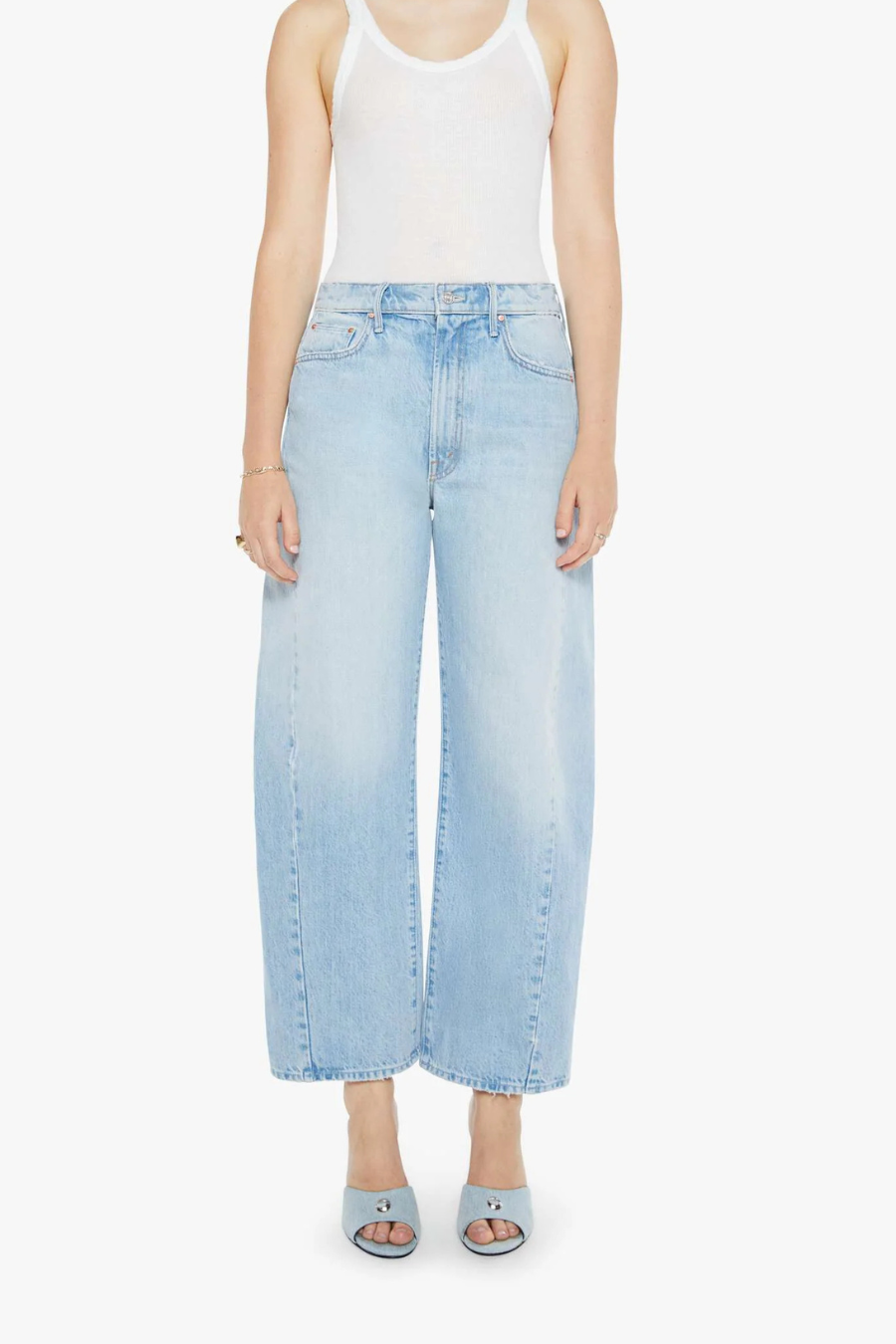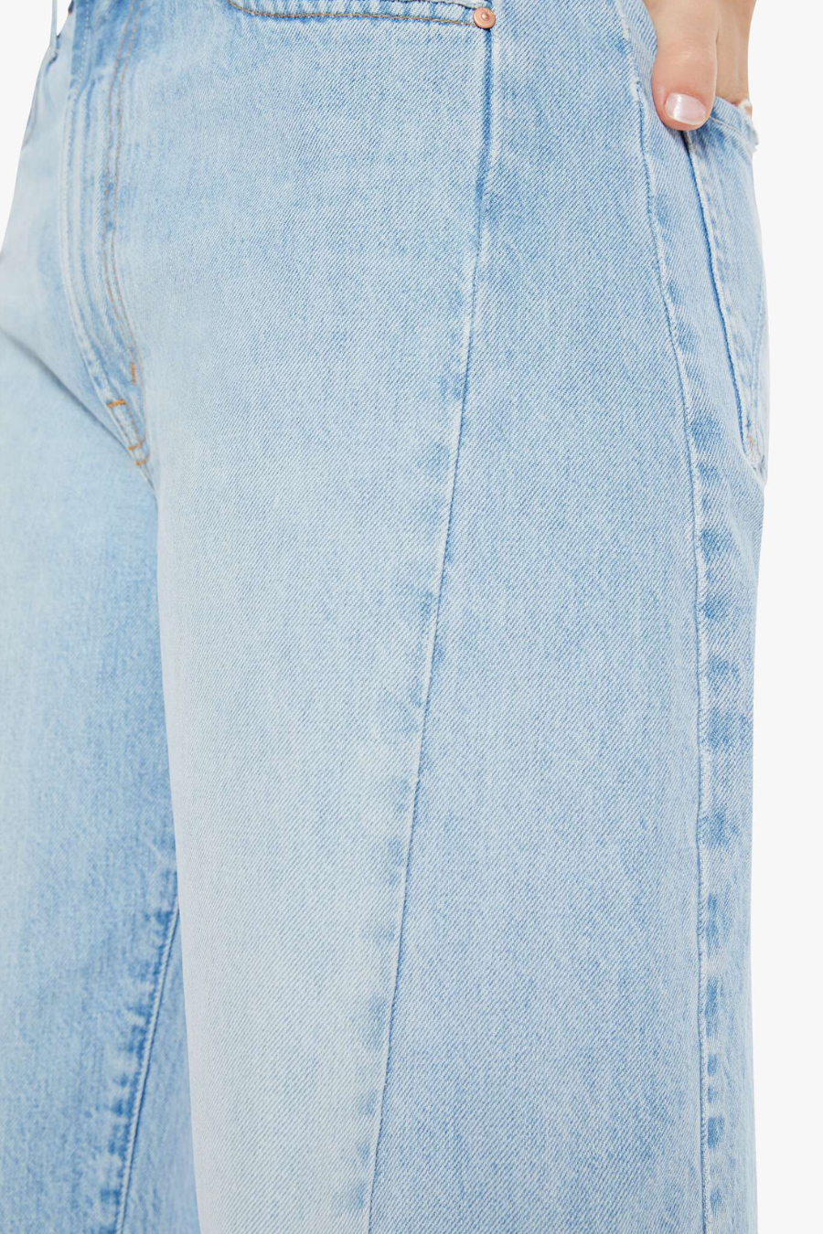 Back on track. Super high-waisted pants with a full barrel leg, a 28.25-inch inseam and a clean hem. Made from rigid SUPERIOR denim, Back Pedal is a light blue with subtle whiskering, fading and distressed details throughout.