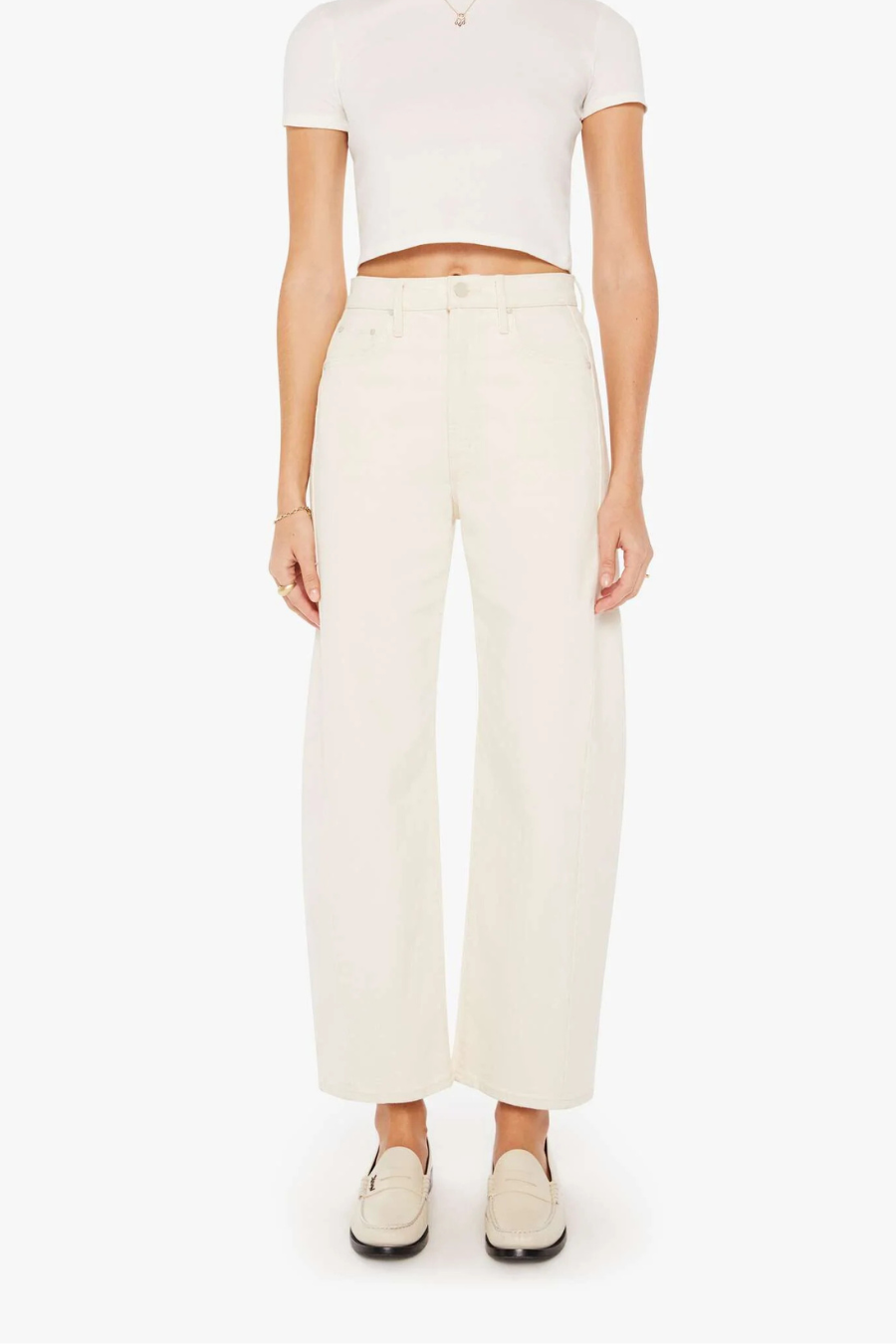 Au naturel. A super high-waisted jean with a wide, curved leg, a 29" inseam, and a clean hem. Cut from a SUPERIOR cotton blend with a touch of stretch, Act Natural is a creamy white hue with tonal hardware.