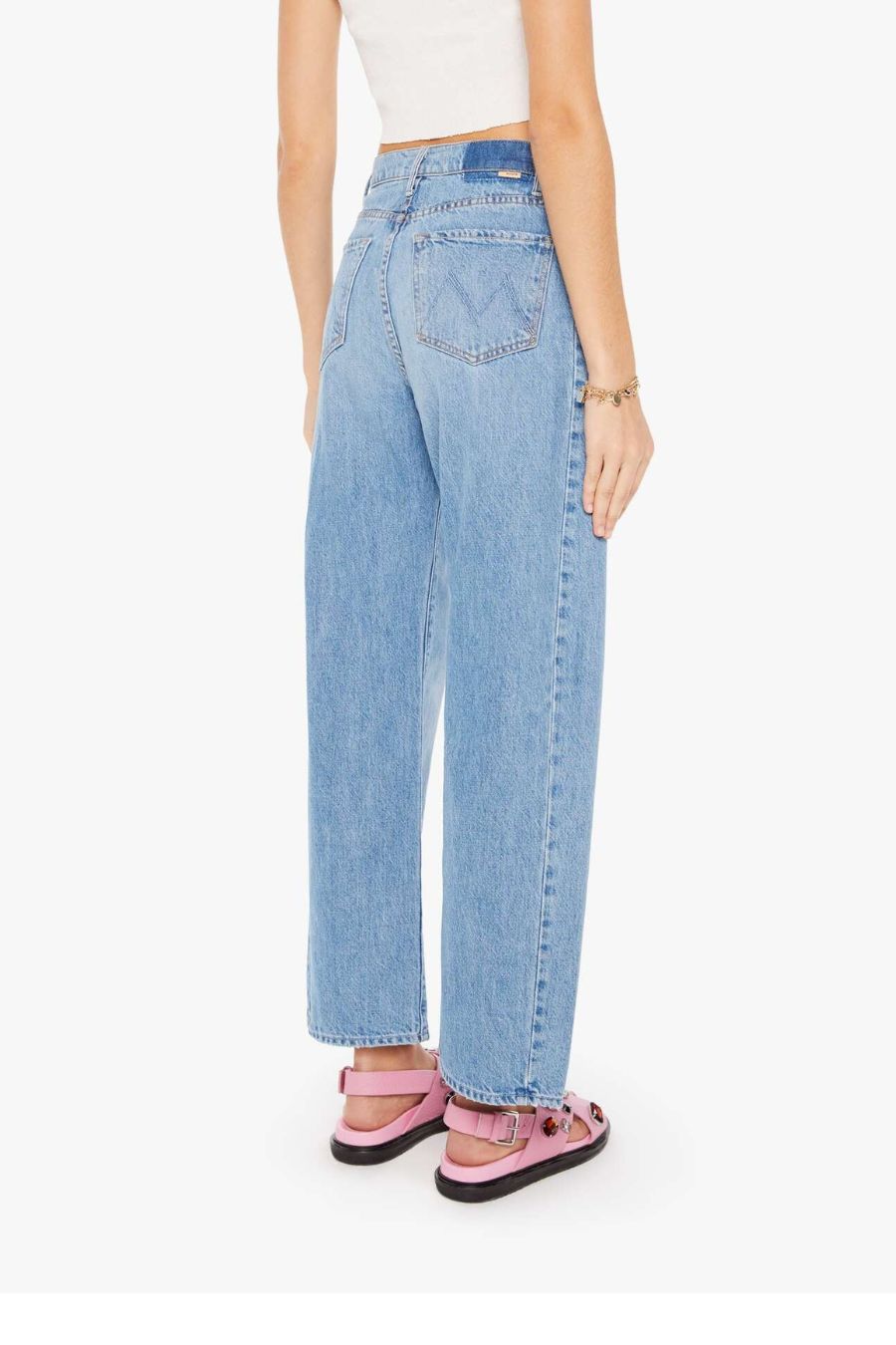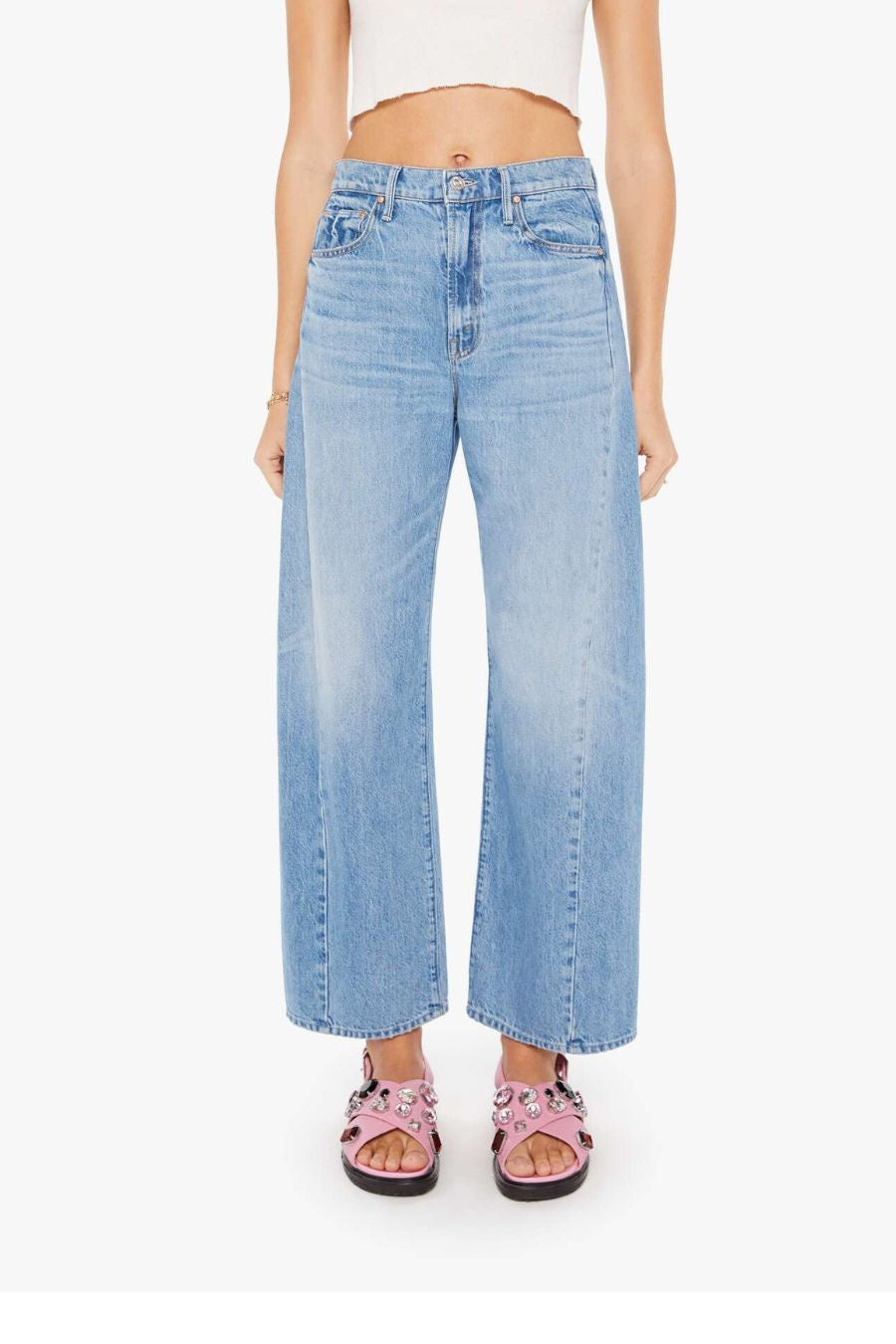 Living in a material world. A super high-waisted jean with a wide, curved leg, a 28.25-inch inseam and a clean hem. Cut from SUPERIOR 100% cotton, Material Girl is a vintage blue wash with whiskering and fading at the knee.