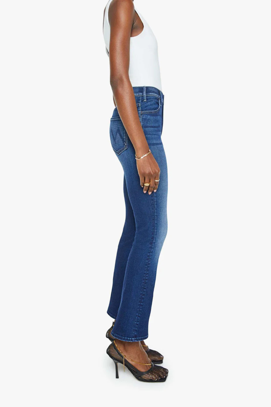 This high-rise flare has an ankle-length inseam and a clean hem. Cut from stretch denim, Taking Chances is dark blue with subtle whiskering and fading at the knee
