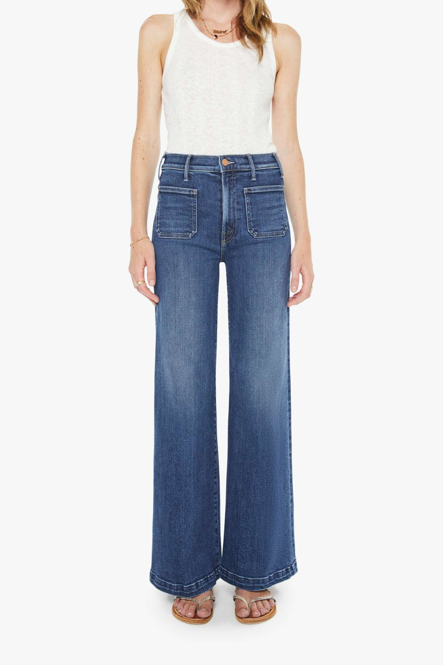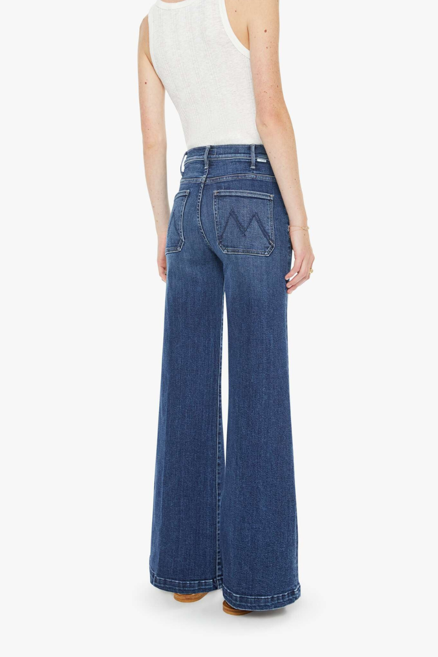 Hail Mary. 70s-inspired wide leg jeans with a high rise, zip fly, patch pockets, 31-inch inseam and a clean hem. Made from stretch denim, One Last Shot is a dark blue with subtle whiskering and fading at the knees.