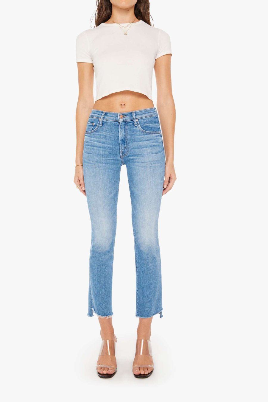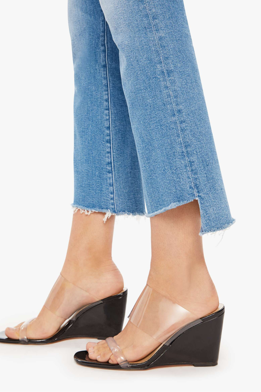 Color me surprised. This iconic high-waisted bootcut is cropped at the ankle with a frayed step-hem. Made from stretch denim, Out Of The Blue is a mid-blue wash with whiskering and fading at the knee.