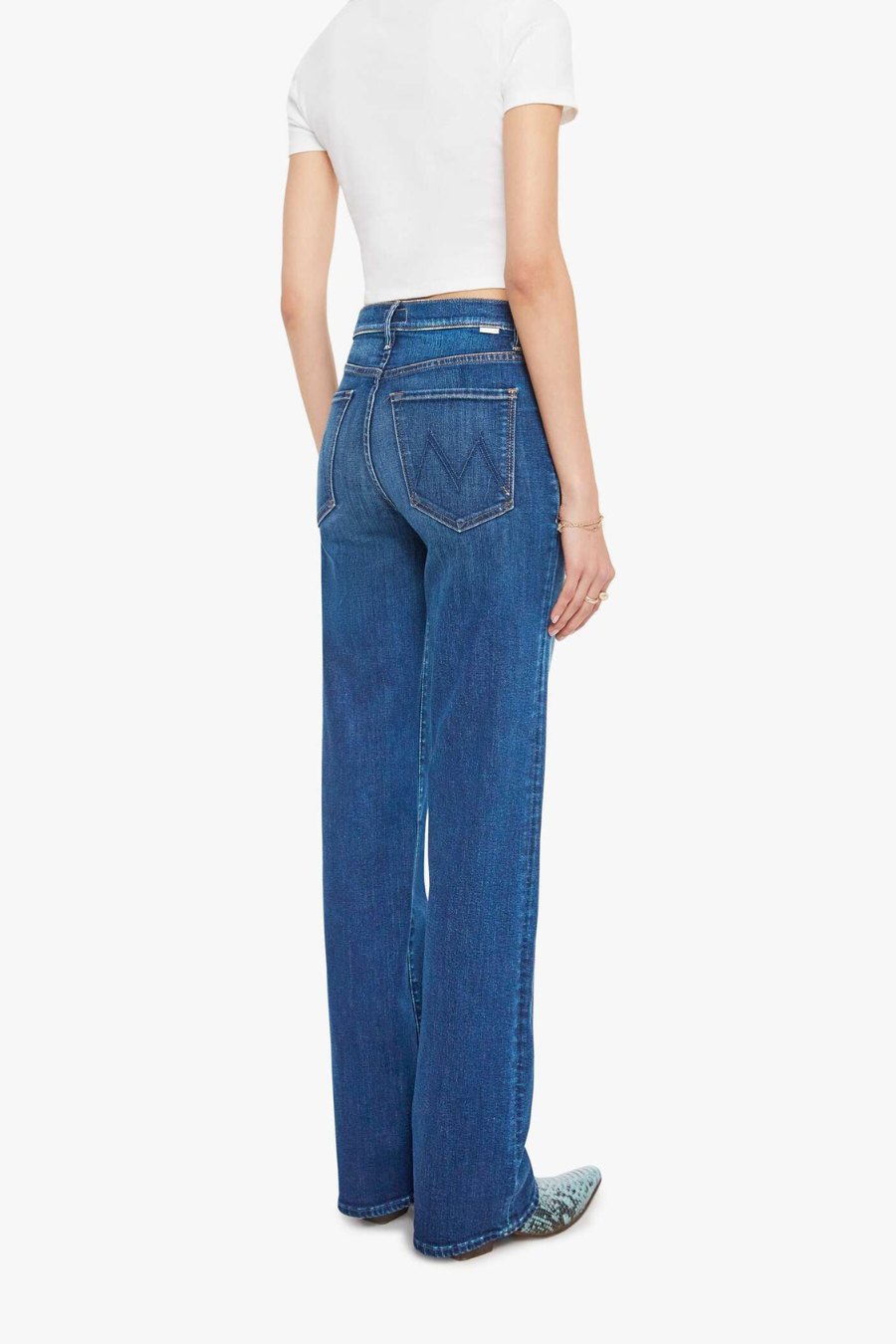Up to no good. A high-rise straight-leg jean with a zip fly, 32-inch inseam and a clean hem. Made from a blend of recycled stretch denim, Troublemaker is a mid-blue with whiskering and fading at the knees.