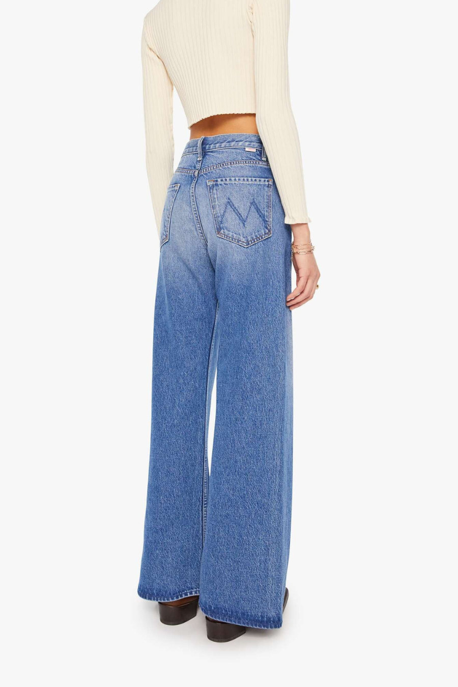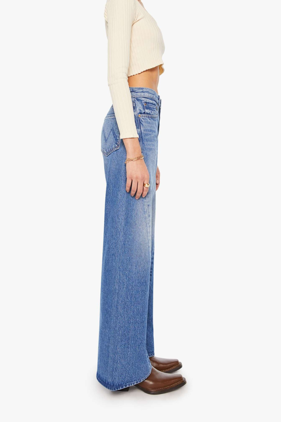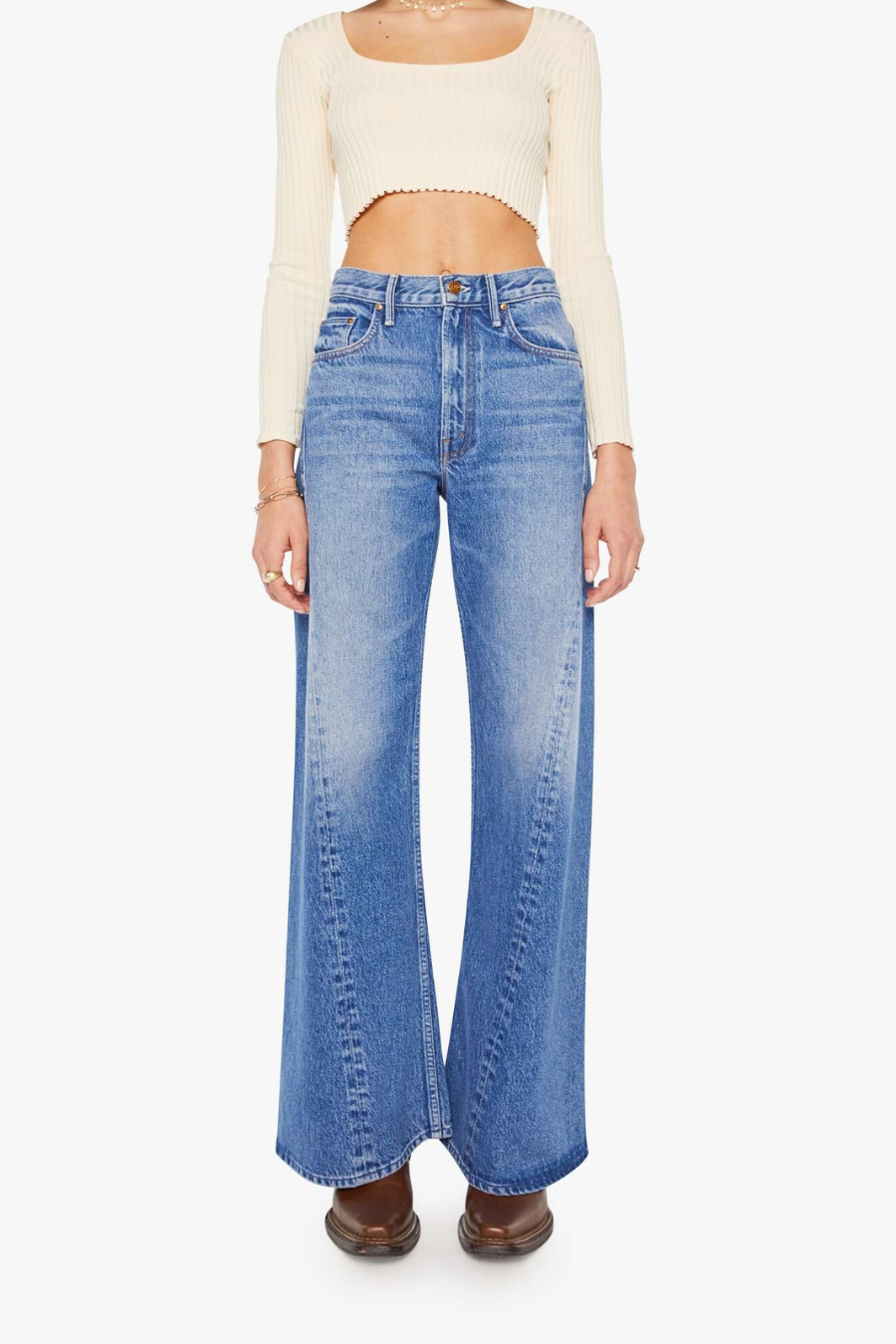These super high-waisted jeans have a loose wide leg with a curved outer seam and a long 33.5-inch inseam with a clean hem. Made from a rigid recycled cotton blend, Rolling In The Dough is a mid-blue with a pretzel-detailed button and candy-inspired interior rivets.